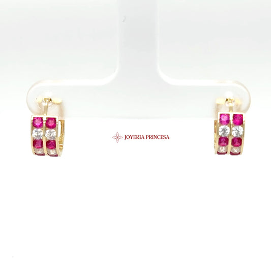 14K Gold Huggie Earrings with Pink & Clear CZ Stones