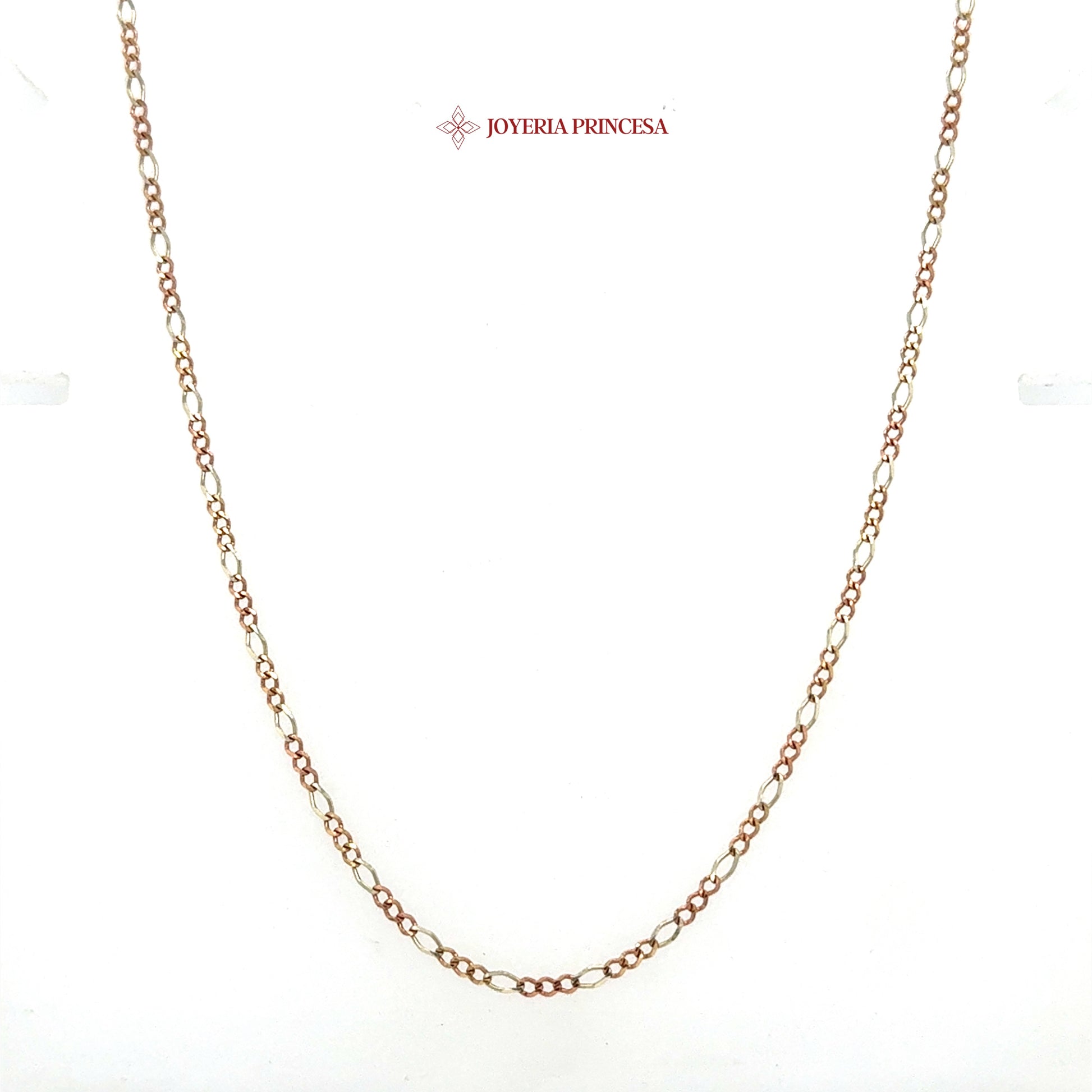 A sophisticated two-tone Figaro chain, featuring alternating gold and rose gold links, perfect for layering or as a standalone piece to enhance any outfit.