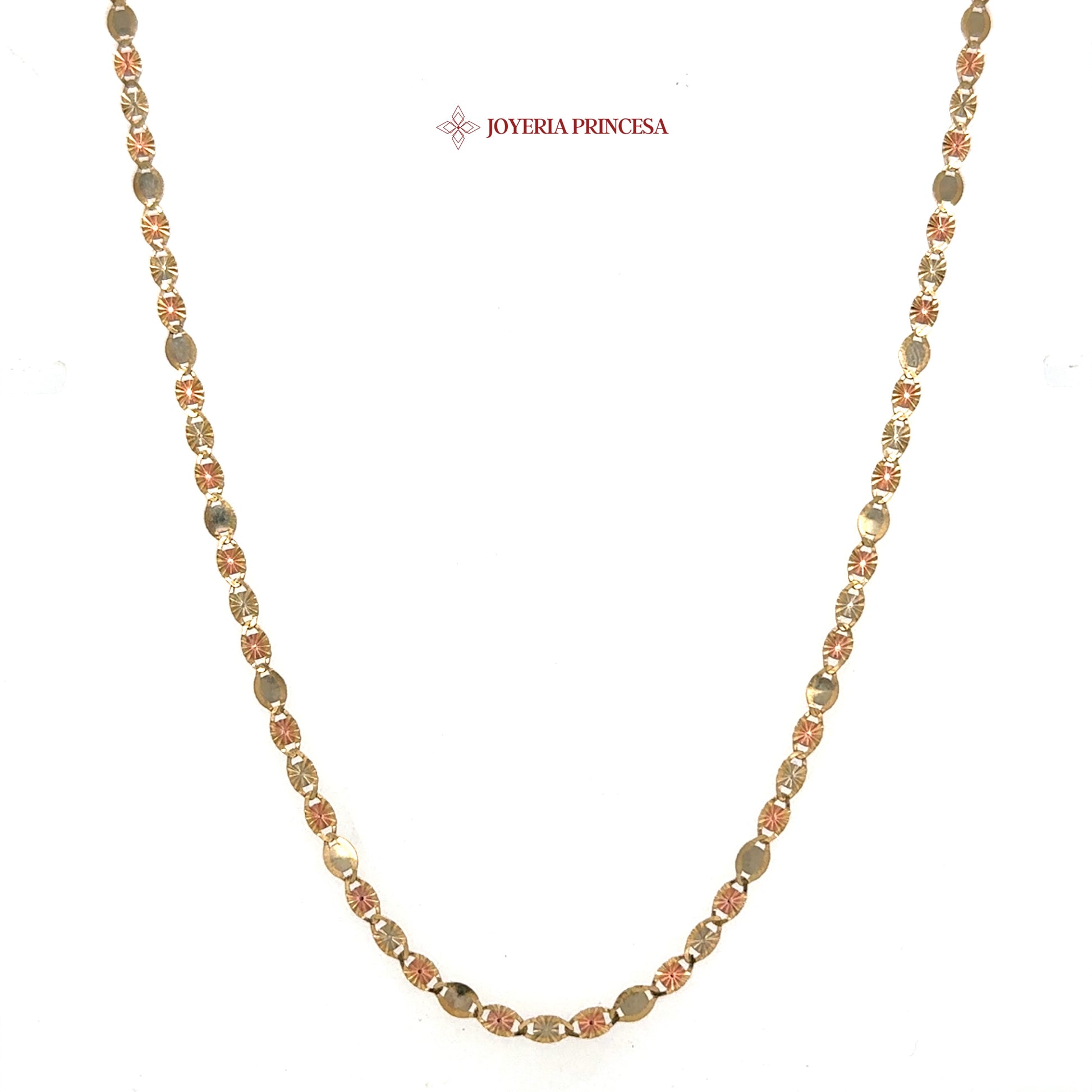 This graceful two-tone Valentino Star necklace features polished links, alternating between shimmering gold and rose gold finishes that capture light beautifully with a luxurious glow.