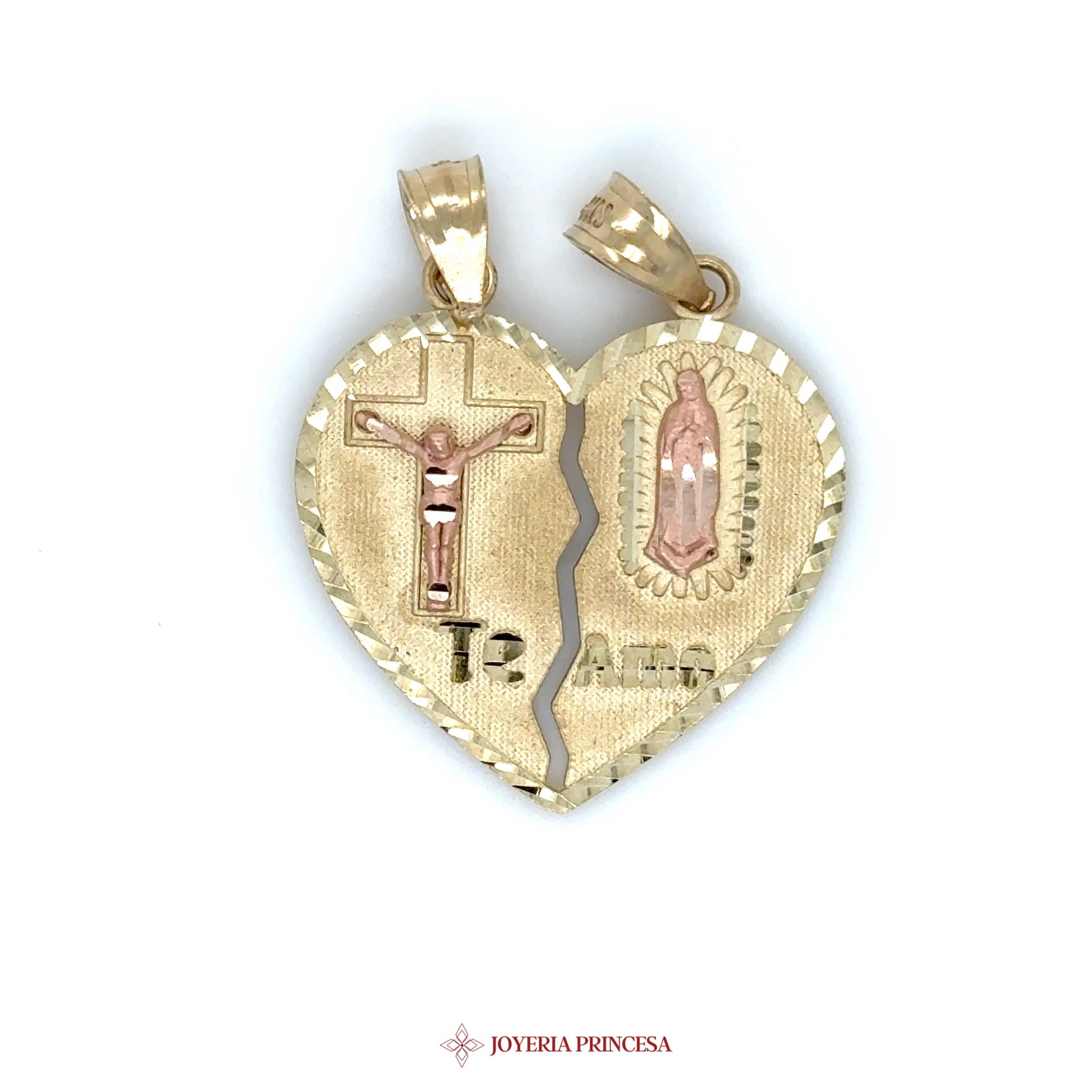 ES: Un impresionante colgante de corazón de doble cara que presenta a Jesús y María, perfecto para expresar la fe. • Elaborado en oro de 10K • Diseño único con detalles intrincados • Ideal para regalar o uso personal