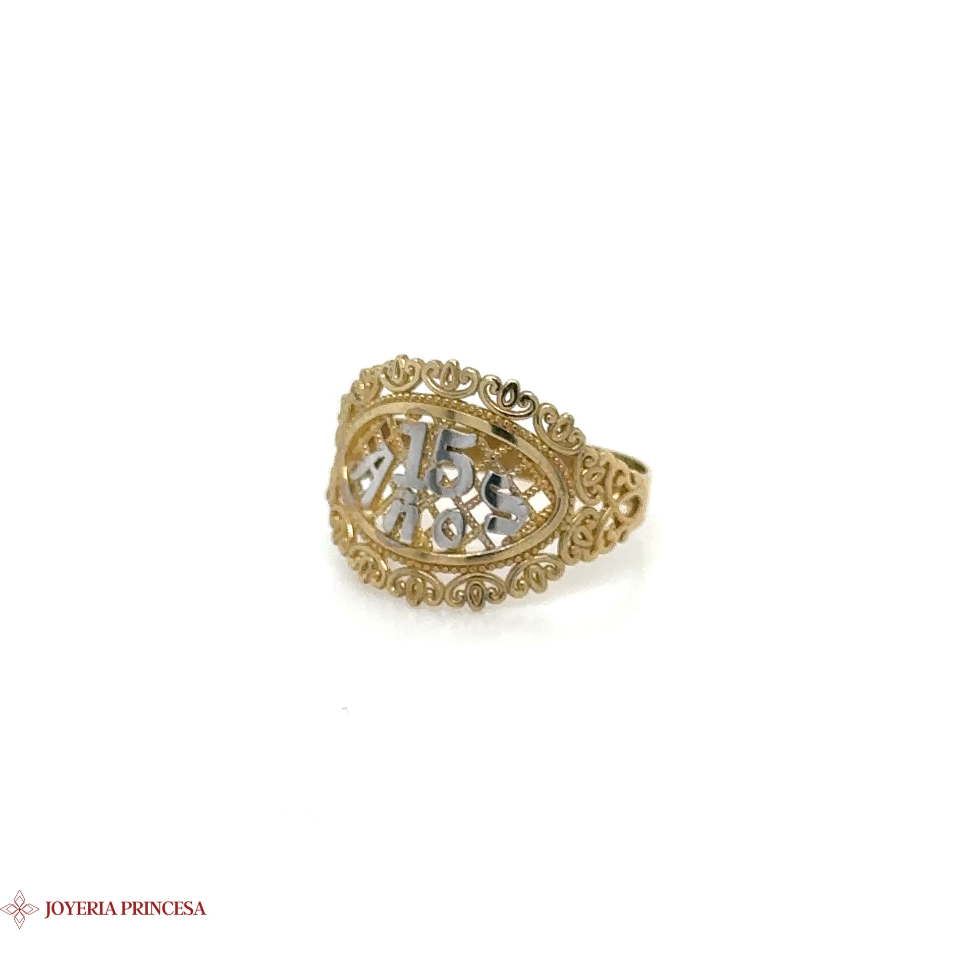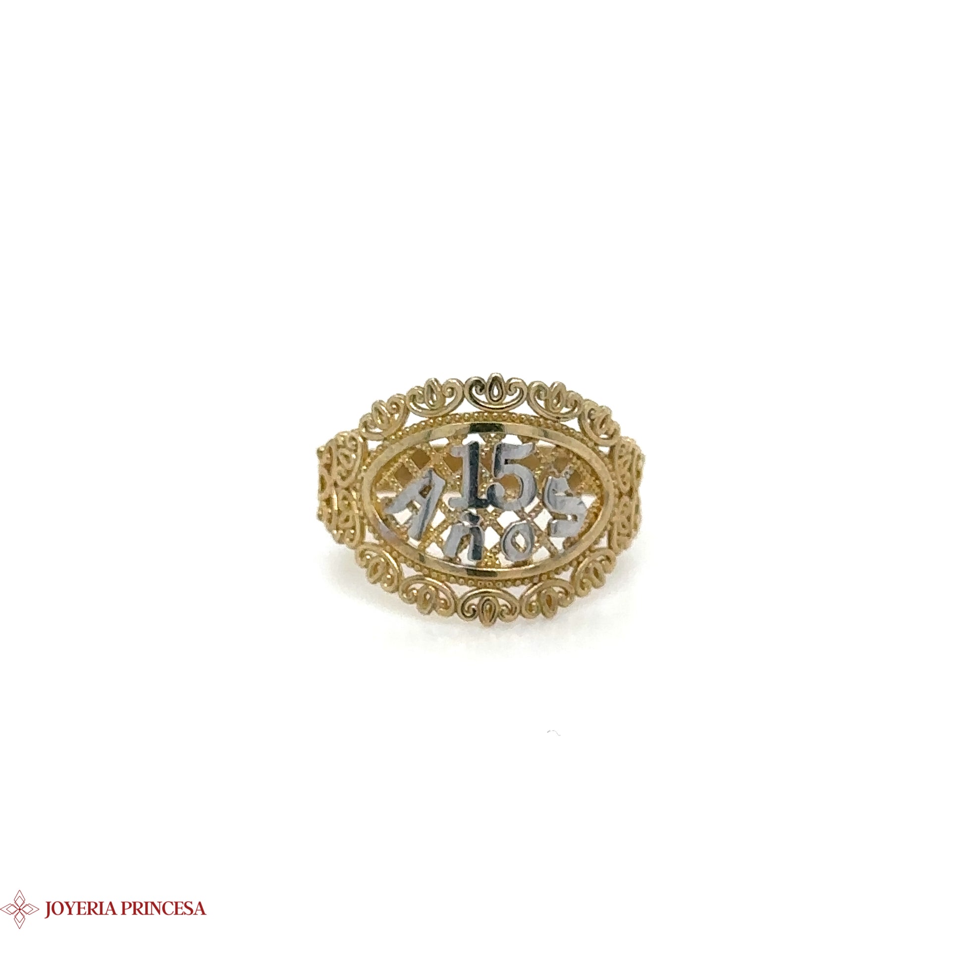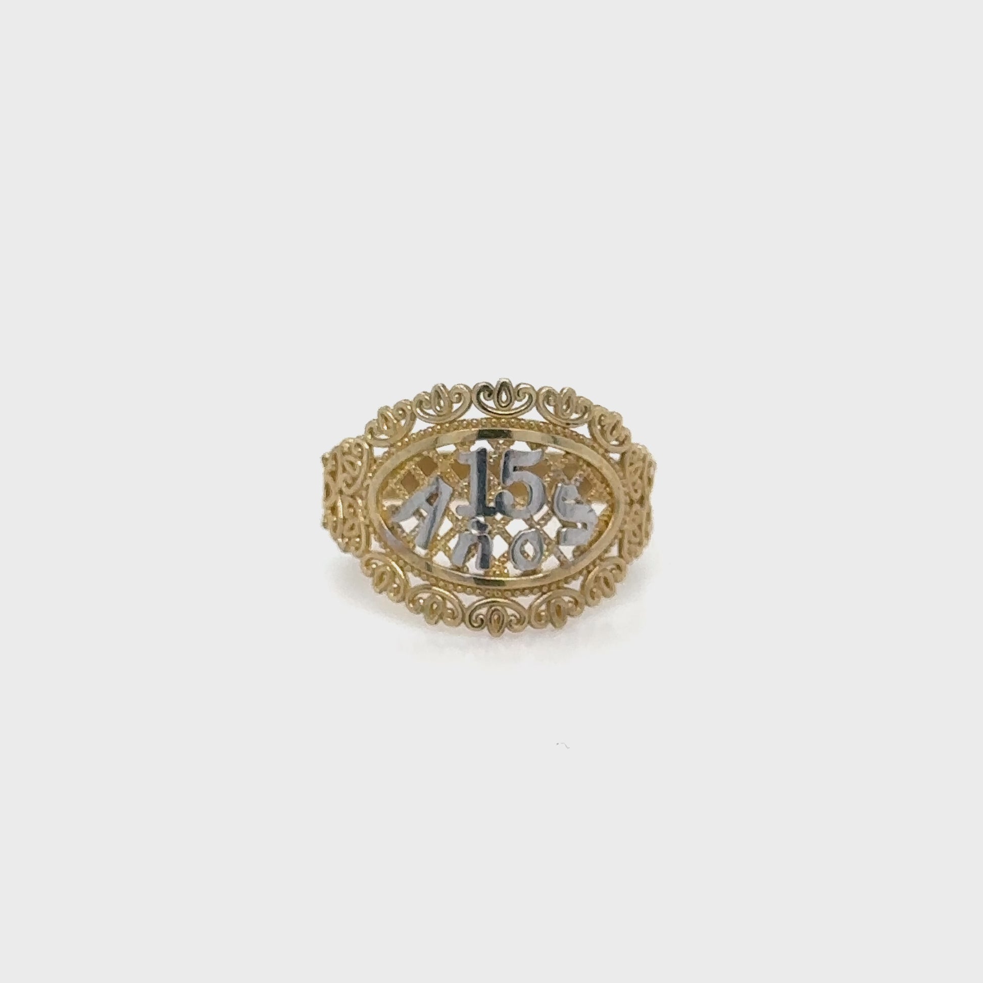 Celebra el hito de la "Quinceañera" con este exquisito anillo de oro de intrincado diseño y simbolismo tradicional, perfecto para regalar. - Inscripción "15 Años" - Brillante acabado en oro - Simbolismo tradicional de la Quinceañera - Artesanía robusta - Ideal para ocasiones especiales