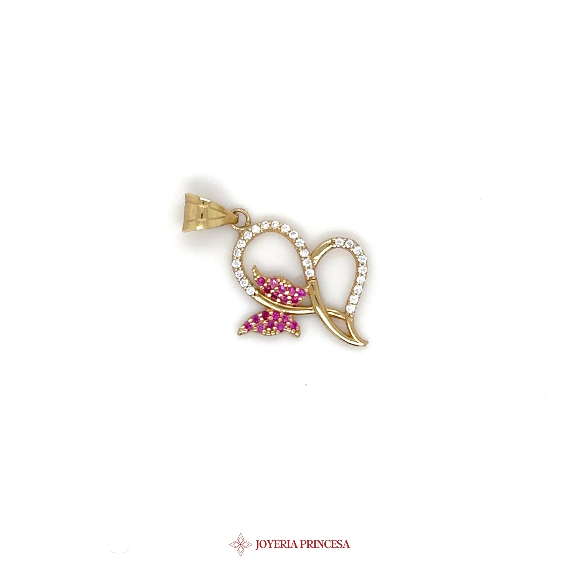 ES: Este encantador colgante de 10K presenta una mariposa anidada en un diseño de corazón. • Fabricado en oro de 10K genuino • Adornado con piedras rosas para un toque de color • Perfecto para el uso diario o ocasiones especiales