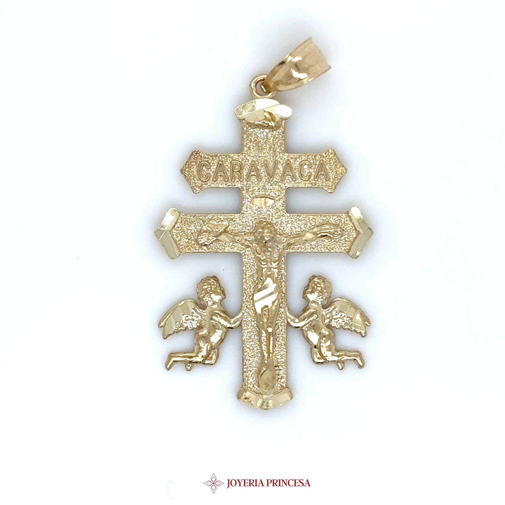 ES: Celebra la fe con este impresionante colgante de cruz de Caravaca con ángeles. • Fabricado en oro de 10K • Detalles intrincados • Perfecto para el uso diario