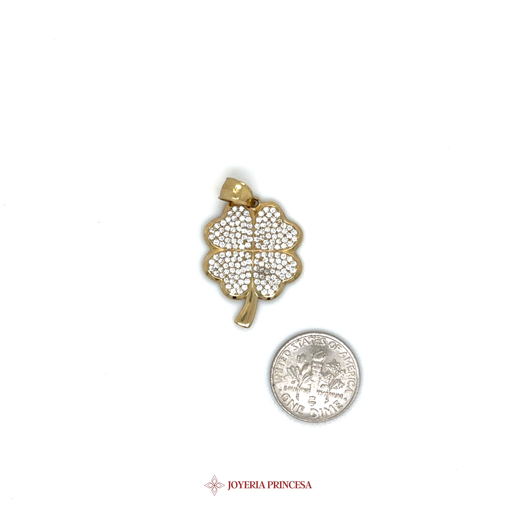 ES: Abraza la buena suerte con este exquisito colgante de trébol de cuatro hojas en oro de 10K. • Elaborado con brillantes piedras de circonita cúbica • Acabado dorado elegante • Perfecto para cualquier ocasión