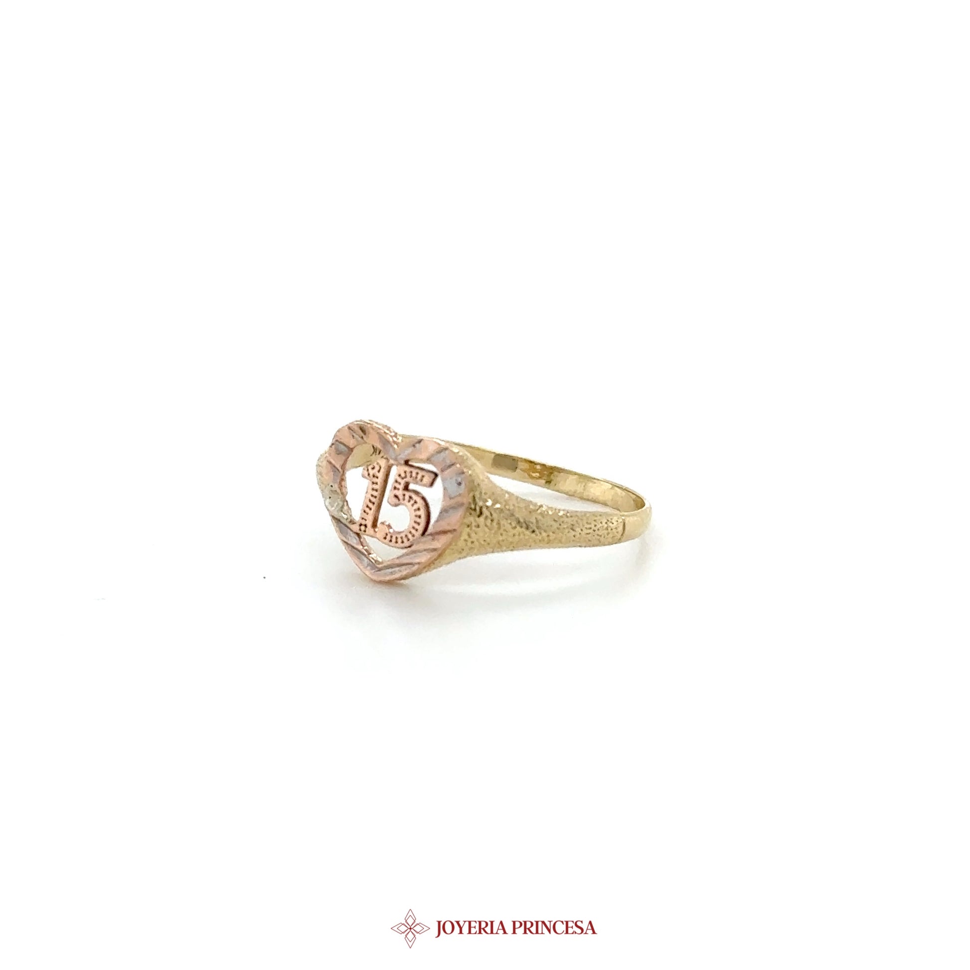 ES: Celebra el amor con este encantador anillo de oro de 10K con un motivo de '15'. • Elaborado en oro de 10K duradero • Diseño elegante en forma de corazón • Perfecto para ocasiones especiales