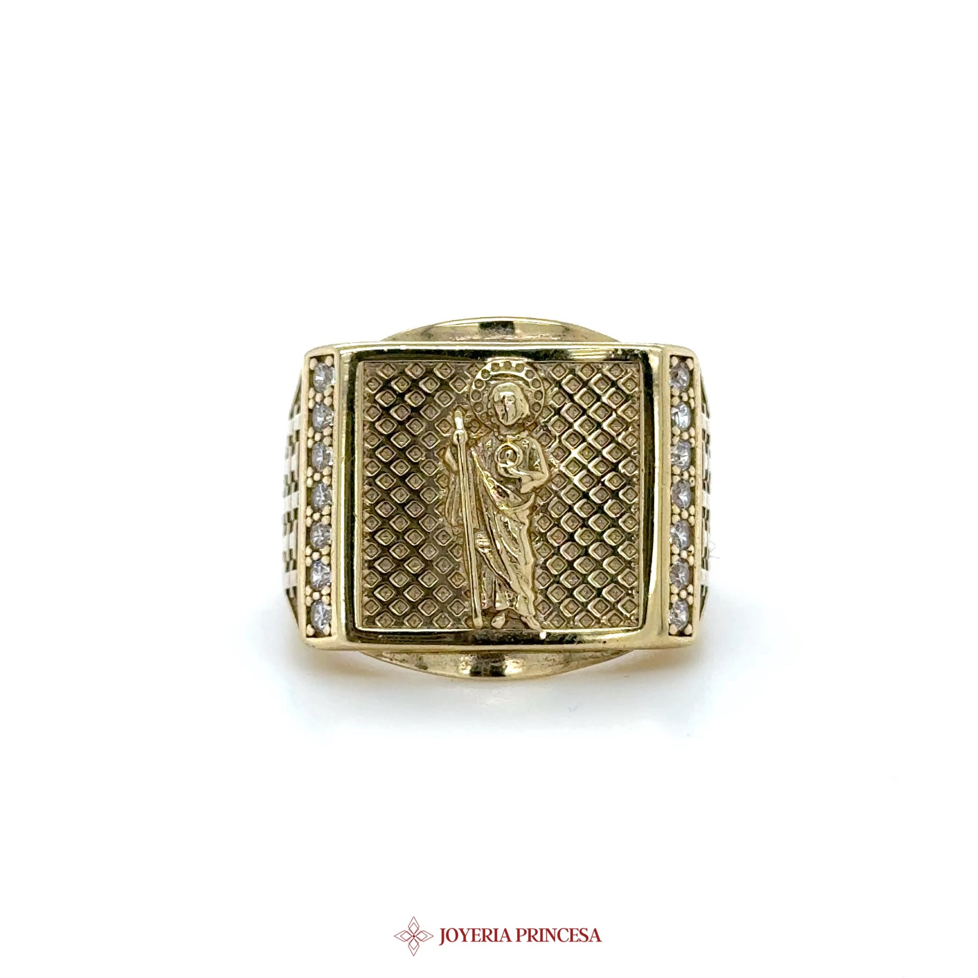 EN: This stunning 10K gold ring features a detailed religious motif, surrounded by sparkling CZ accents for a touch of elegance. • Crafted from durable 10K gold • Intricate design for a meaningful statement • Perfect for everyday wear or special occasions.
