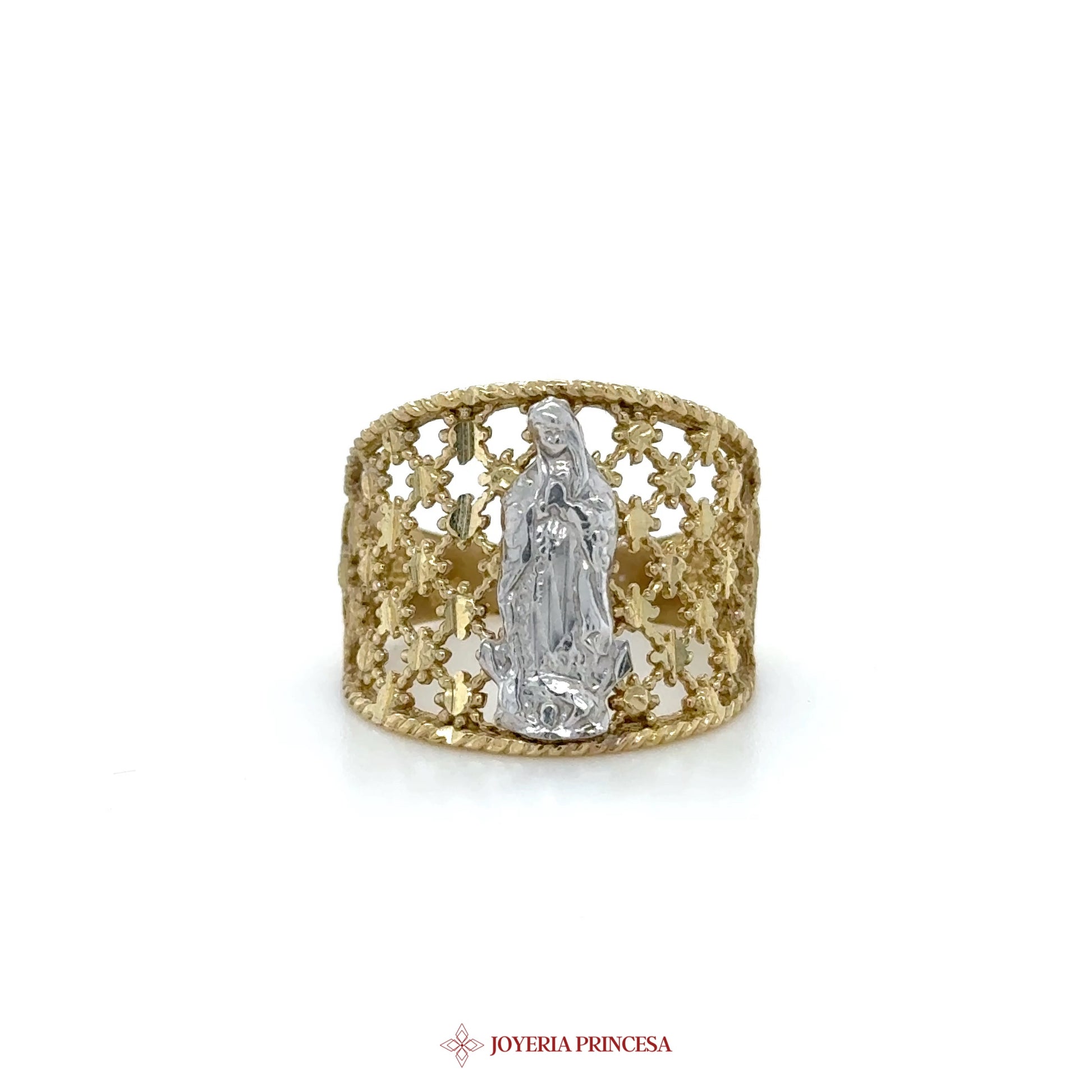 EN: Celebrate your faith with this stunning 10K gold ring featuring a beautiful religious motif and star cutouts. • Crafted from high-quality 10K gold • Intricate star design adds elegance • Perfect for everyday wear or special occasions
