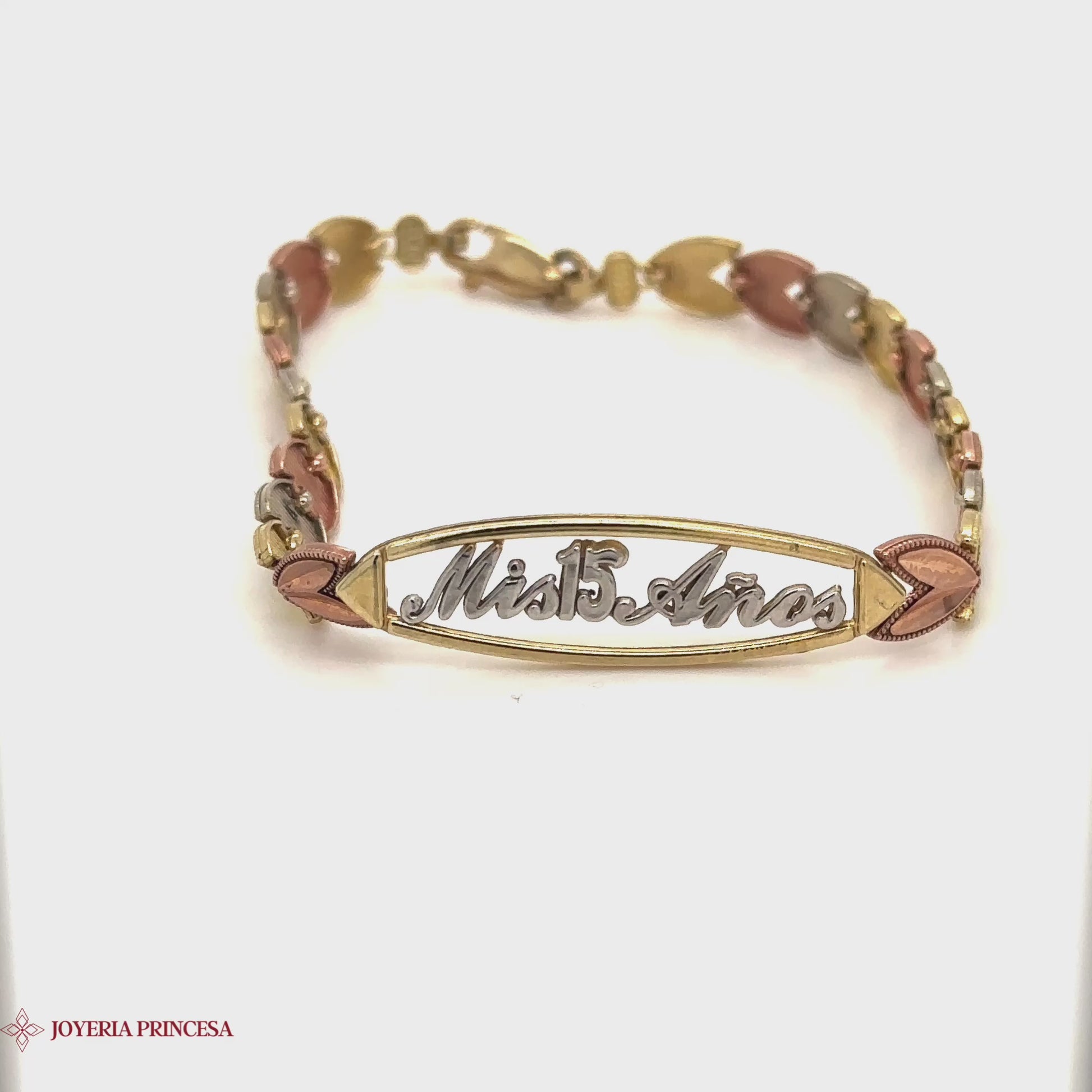 Embárcate en el viaje de niña a mujer con la exquisita pulsera tricolor Quinceañera de 10K con intrincados eslabones de corazón en oro amarillo, rosa y blanco, una elegante inscripción "Mis 15 Años", que simboliza la transición con un recuerdo único para las celebraciones.