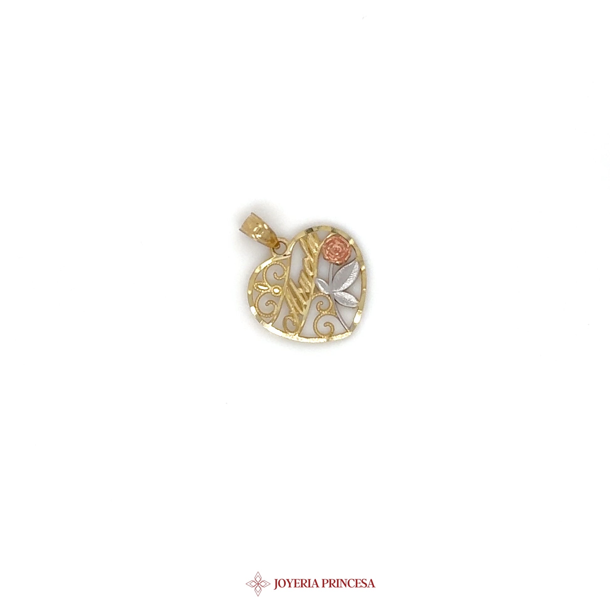 ES: Un impresionante colgante en forma de corazón con un motivo floral en elegante oro de dos tonos. • Fabricado en oro de 10K • Diseño único con detalles intrincados • Perfecto para uso diario o ocasiones especiales