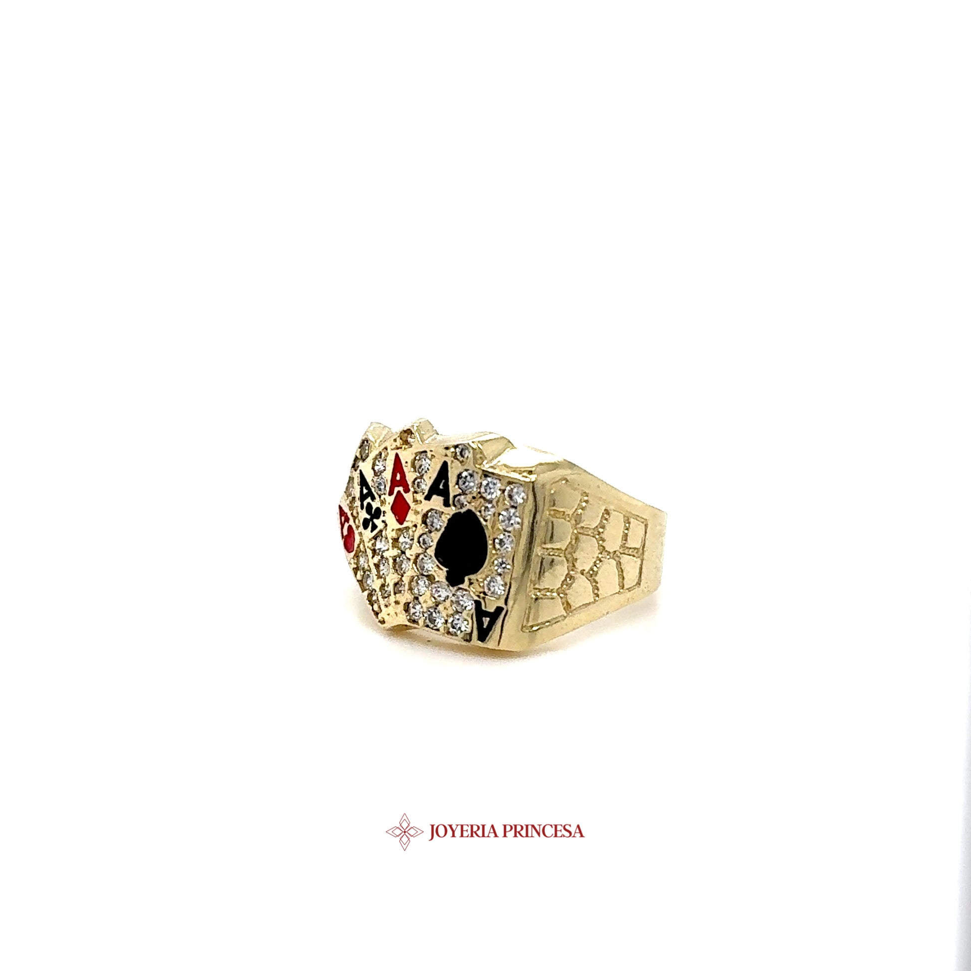 Destaca con este anillo de oro de 10 quilates con un detallado diseño de mano de póquer. Acentos de esmalte y piedras brillantes hacen de este anillo una verdadera pieza de la declaración.