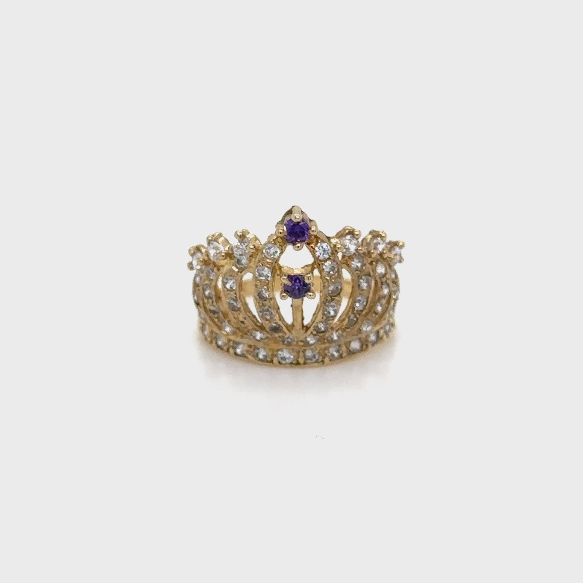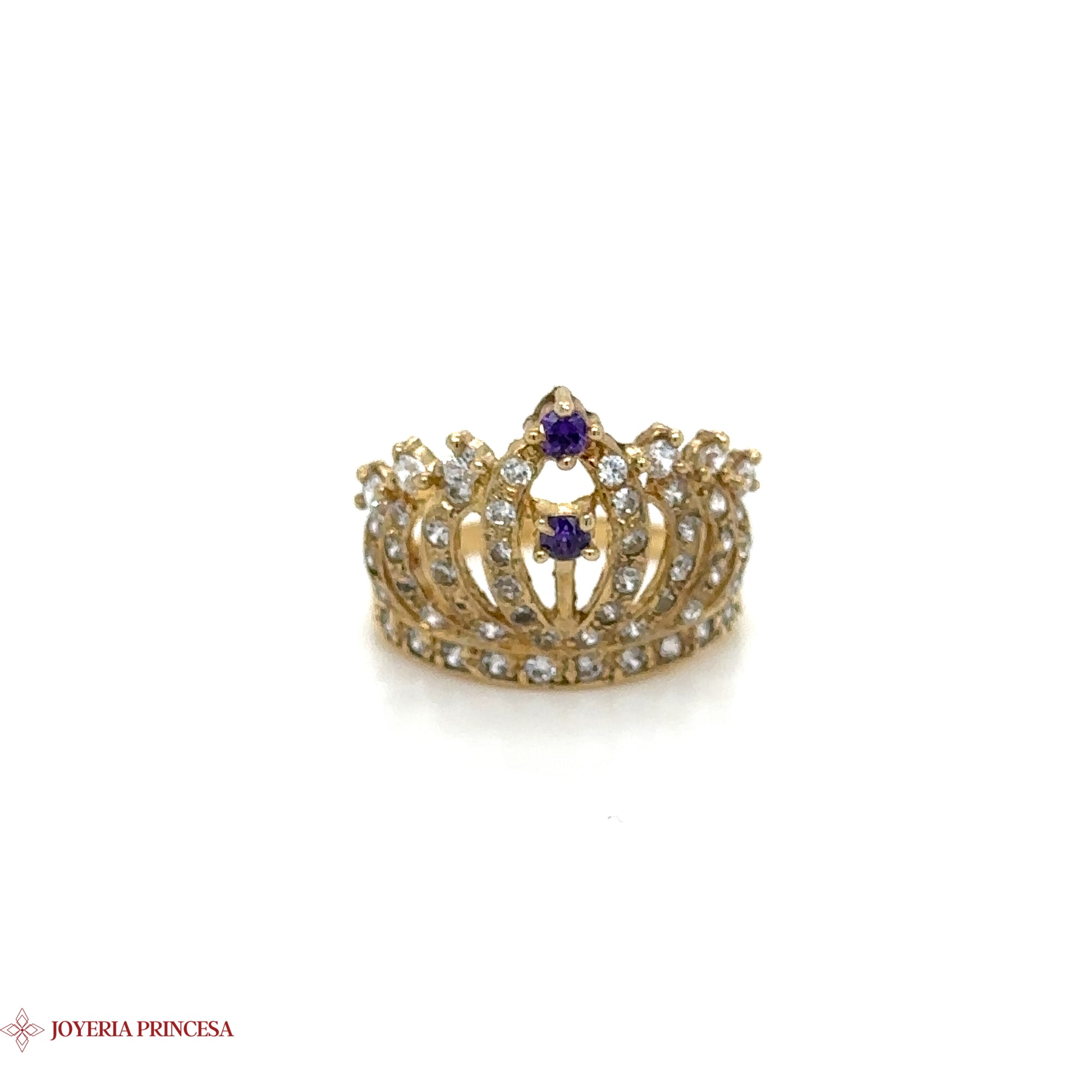 Experimenta la elegancia y la tradición con el Anillo Corona de Quinceañera Regal. Presenta una gema de color púrpura intenso sobre una cálida banda dorada, símbolo de madurez y tradición.