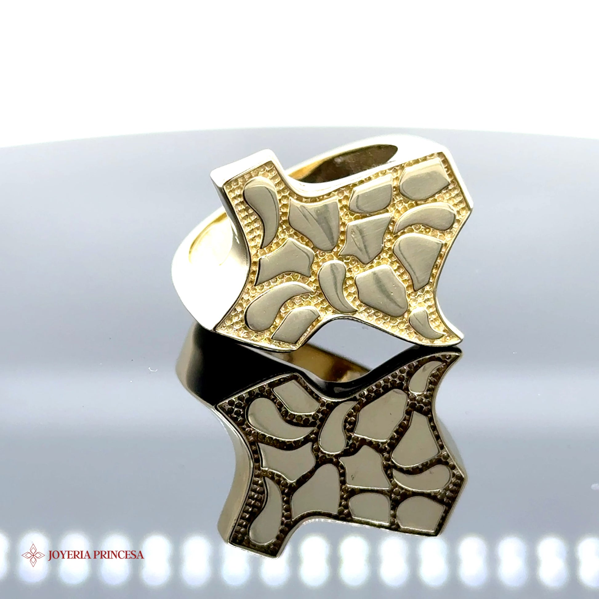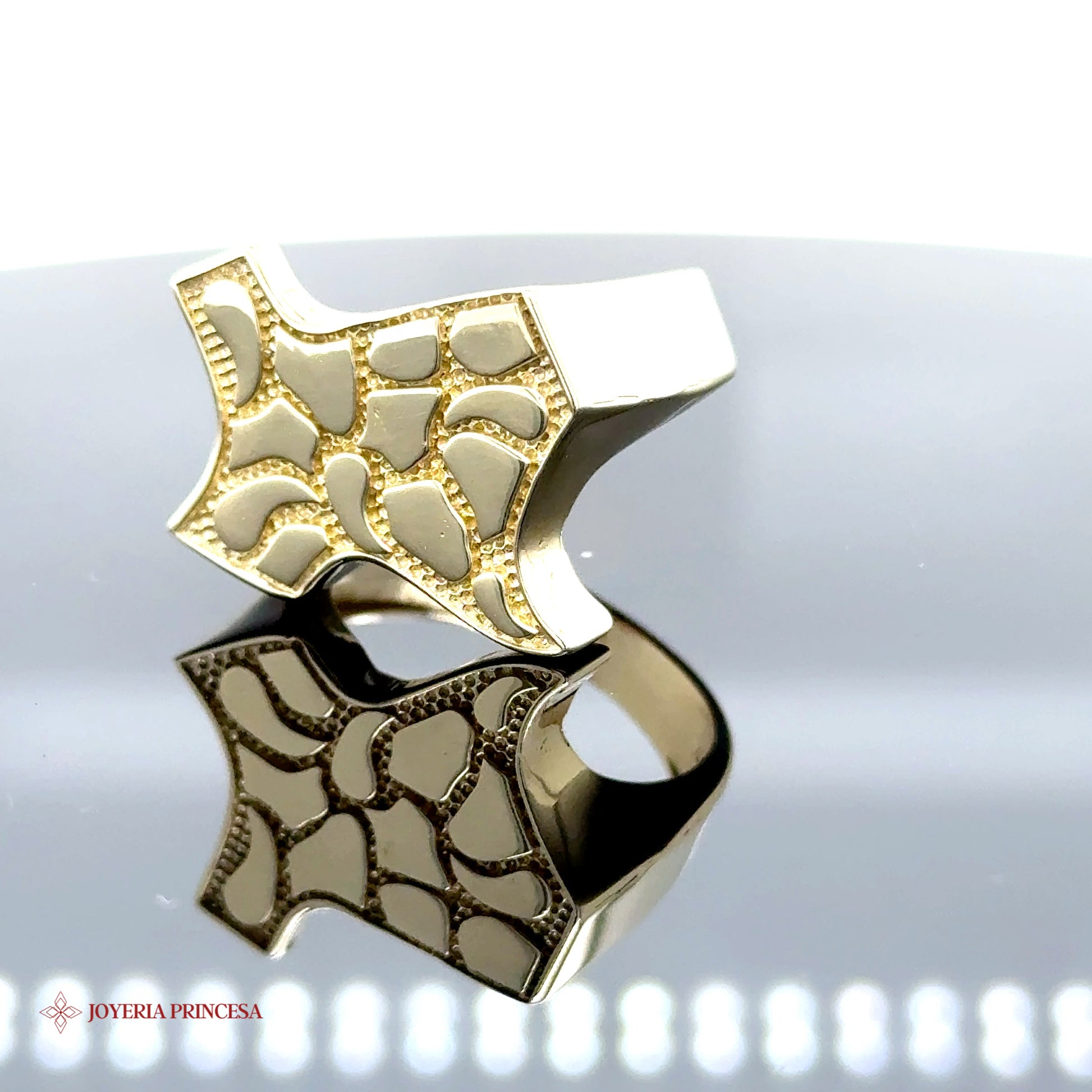 Este impresionante anillo de oro de 10 quilates presenta un distintivo diseño de pepitas de Texas, que captura la esencia del Estado de la Estrella Solitaria. El intrincado diseño de la pepita está bellamente elaborado para resaltar la textura y el brillo únicos del oro.