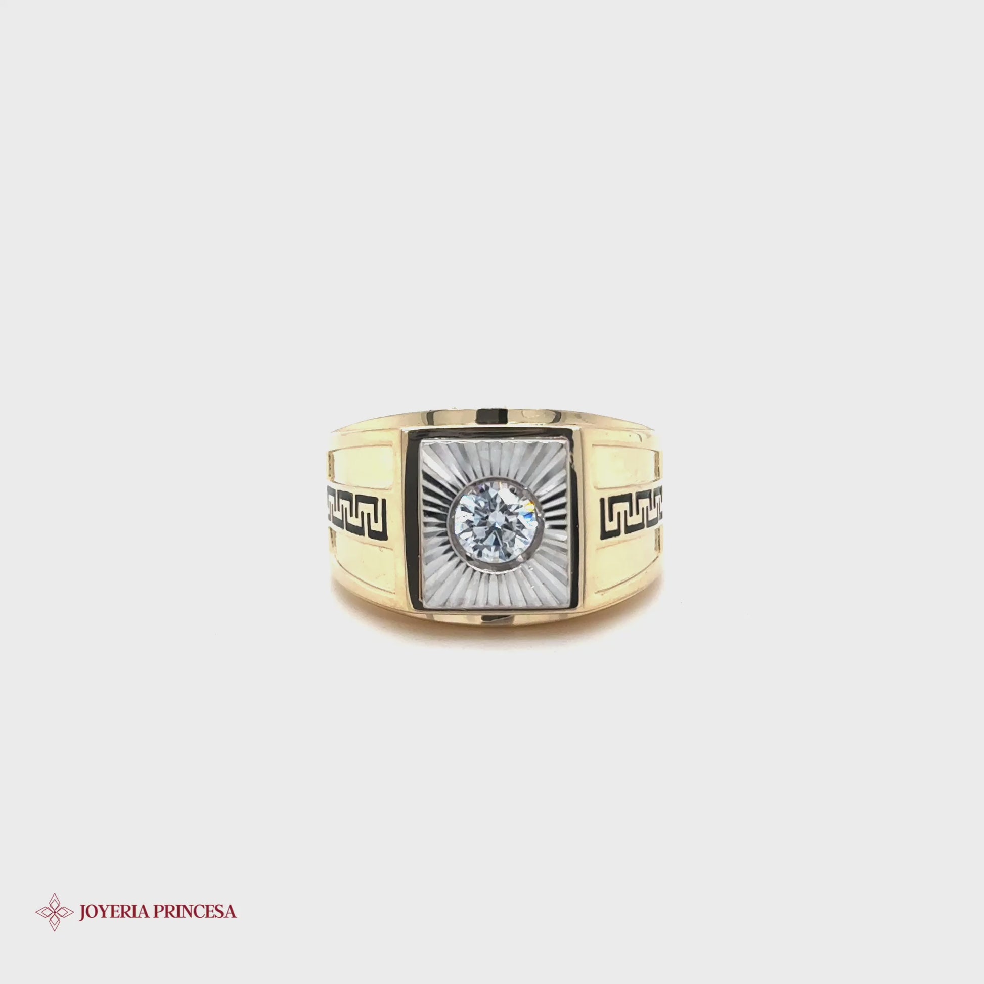 Anillo de oro de 14 quilates con una prominente circonita central y un intrincado diseño de llave griega en la banda.