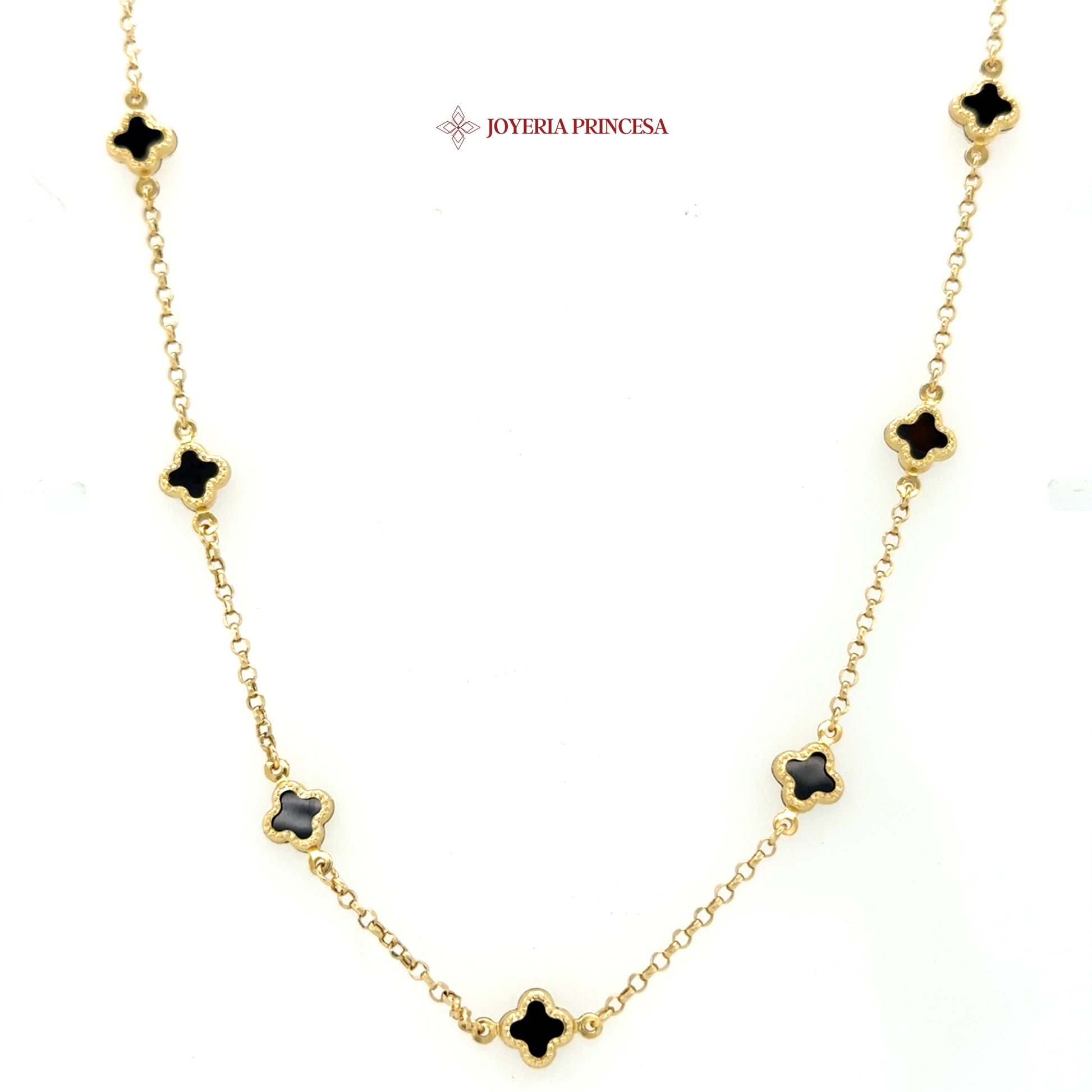 This exquisite necklace features gold links interspersed with striking black clover motifs, offering a sophisticated balance of color and charm for any occasion.