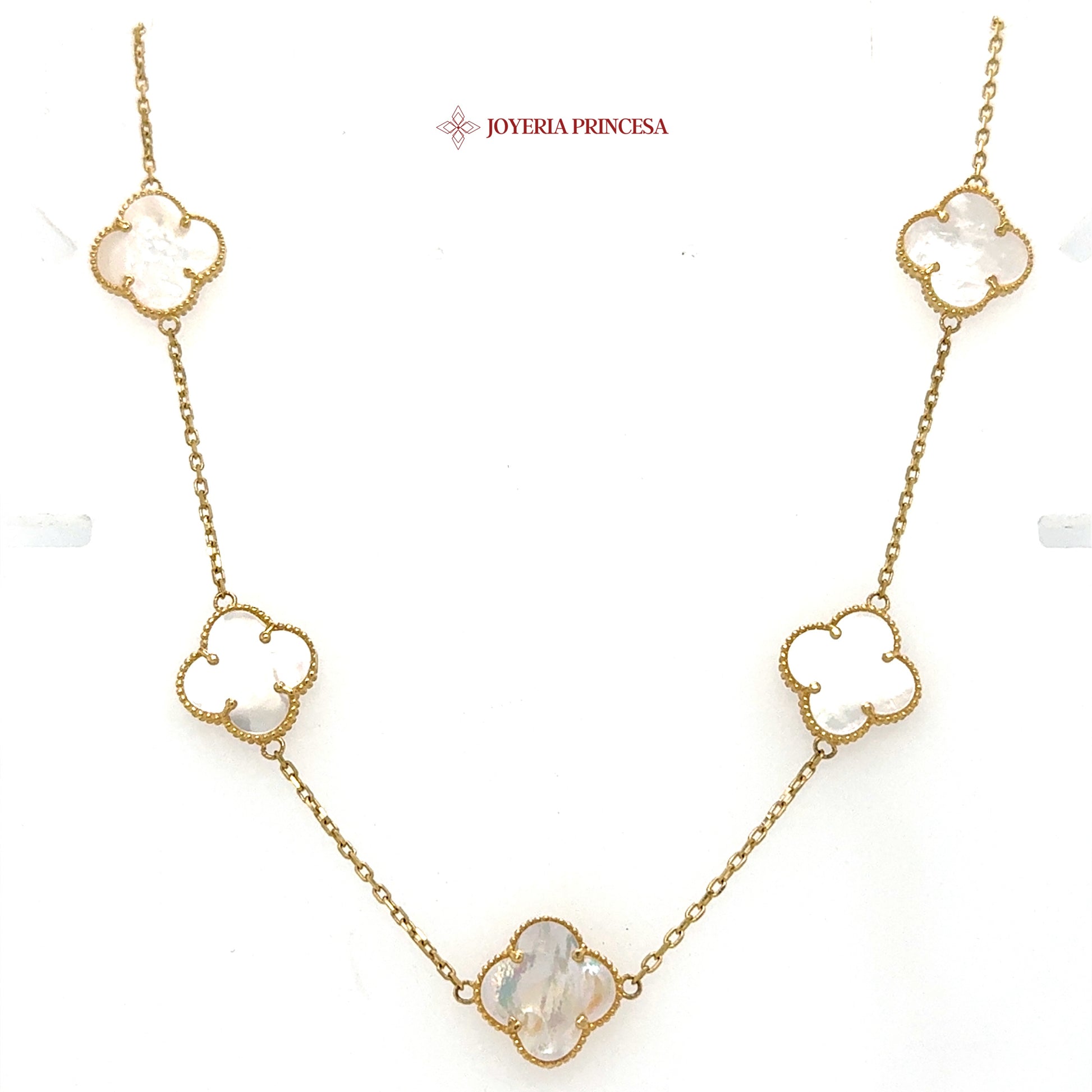 This exquisite necklace features alternating gold clover motifs, each adorned with a shimmering, translucent stone, creating a timeless and luxurious appeal.