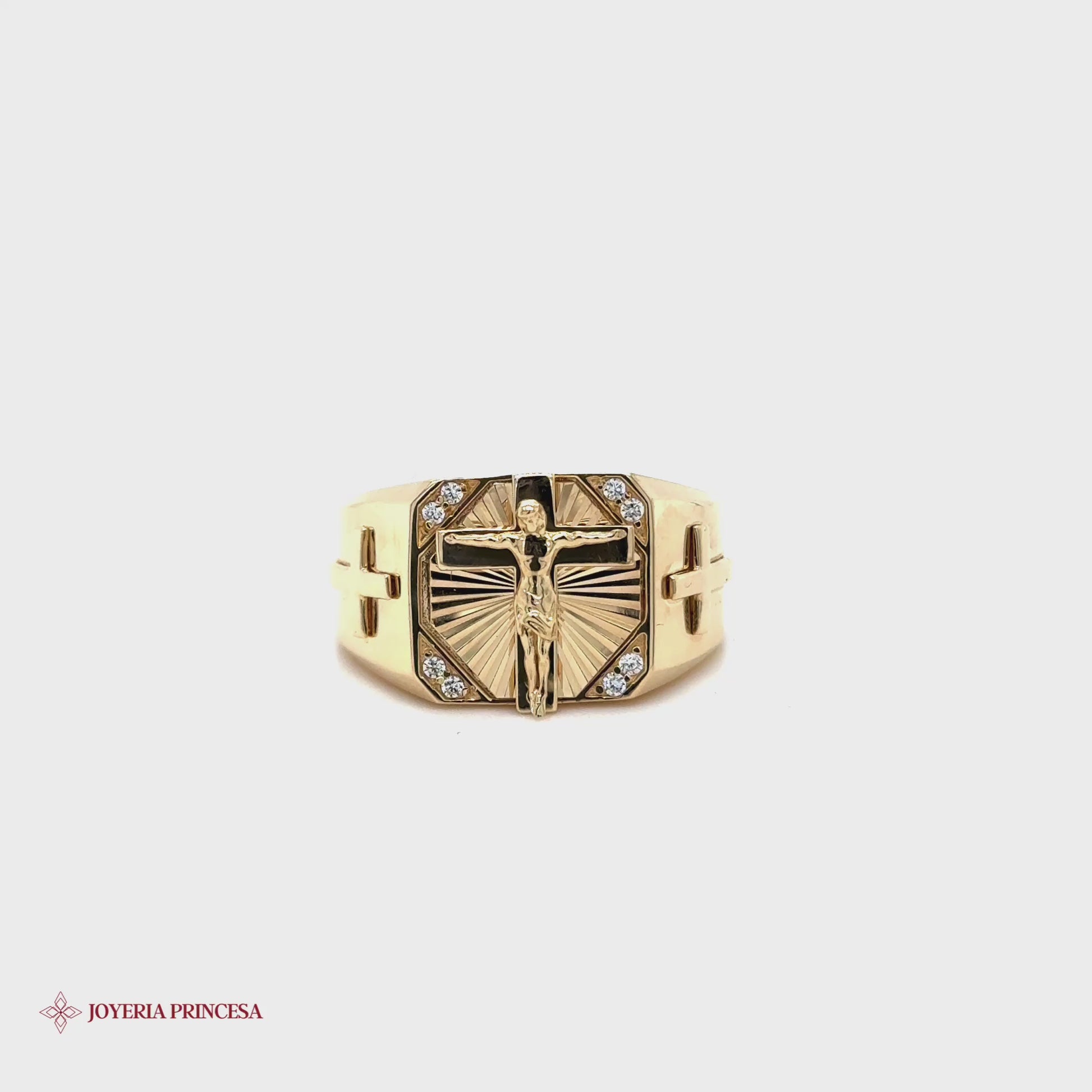 Anillo de oro de 14 quilates con un crucifijo detallado con detalles de circonitas y cruz.
