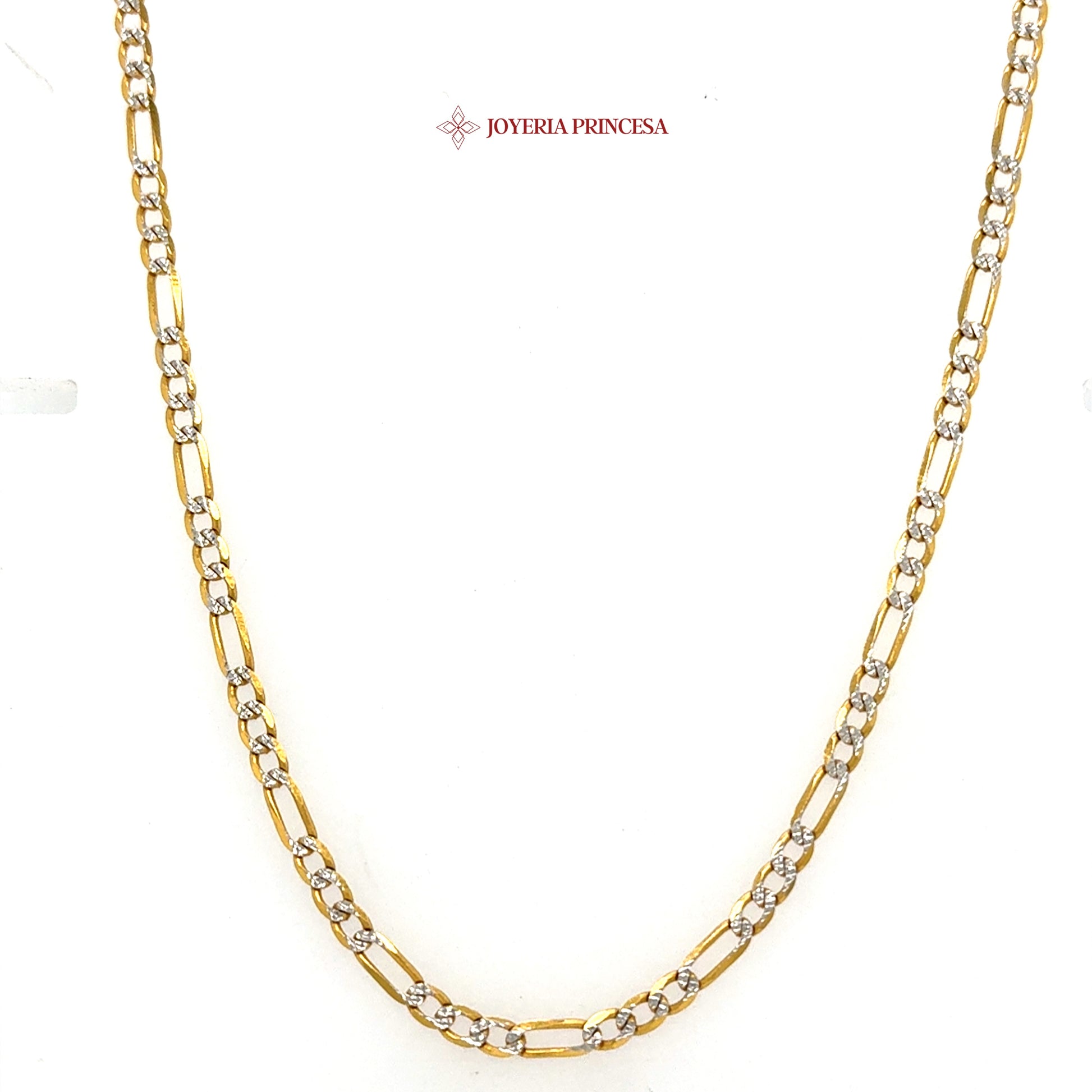 This exquisite 14K Figaro Two-Tone Diamond Cut Chain combines elegance and sophistication, offering a timeless appeal that enhances any ensemble with a touch of luxury and style. - Elegant 14K gold finish - Stylish link design - Secure lobster clasp