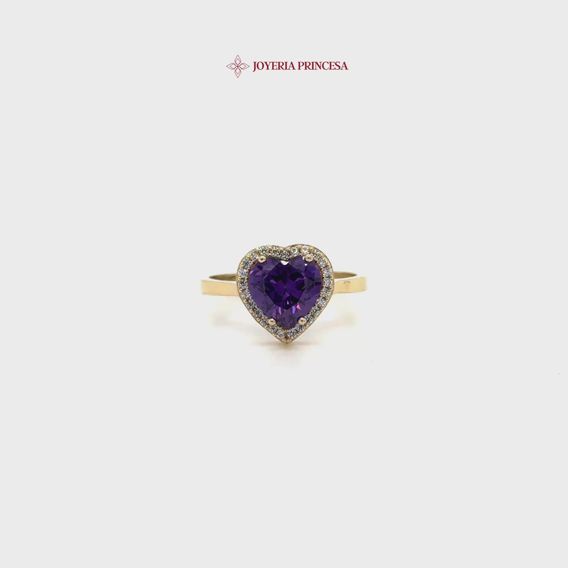 The 14K gold ring features a heart-shaped purple gemstone. It is elegantly designed with a halo of small clear stones around the centerpiece.