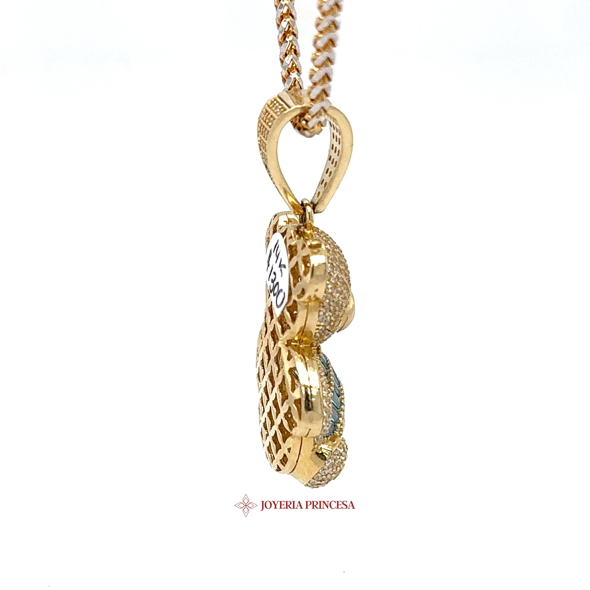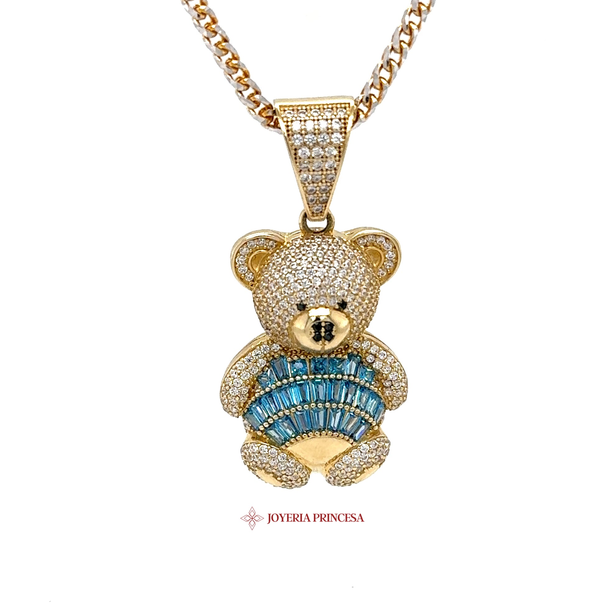 Este colgante de oso de peluche de oro de 14 quilates tiene incrustaciones de piedras brillantes y presenta un hermoso conjunto de circonitas baguette azules.