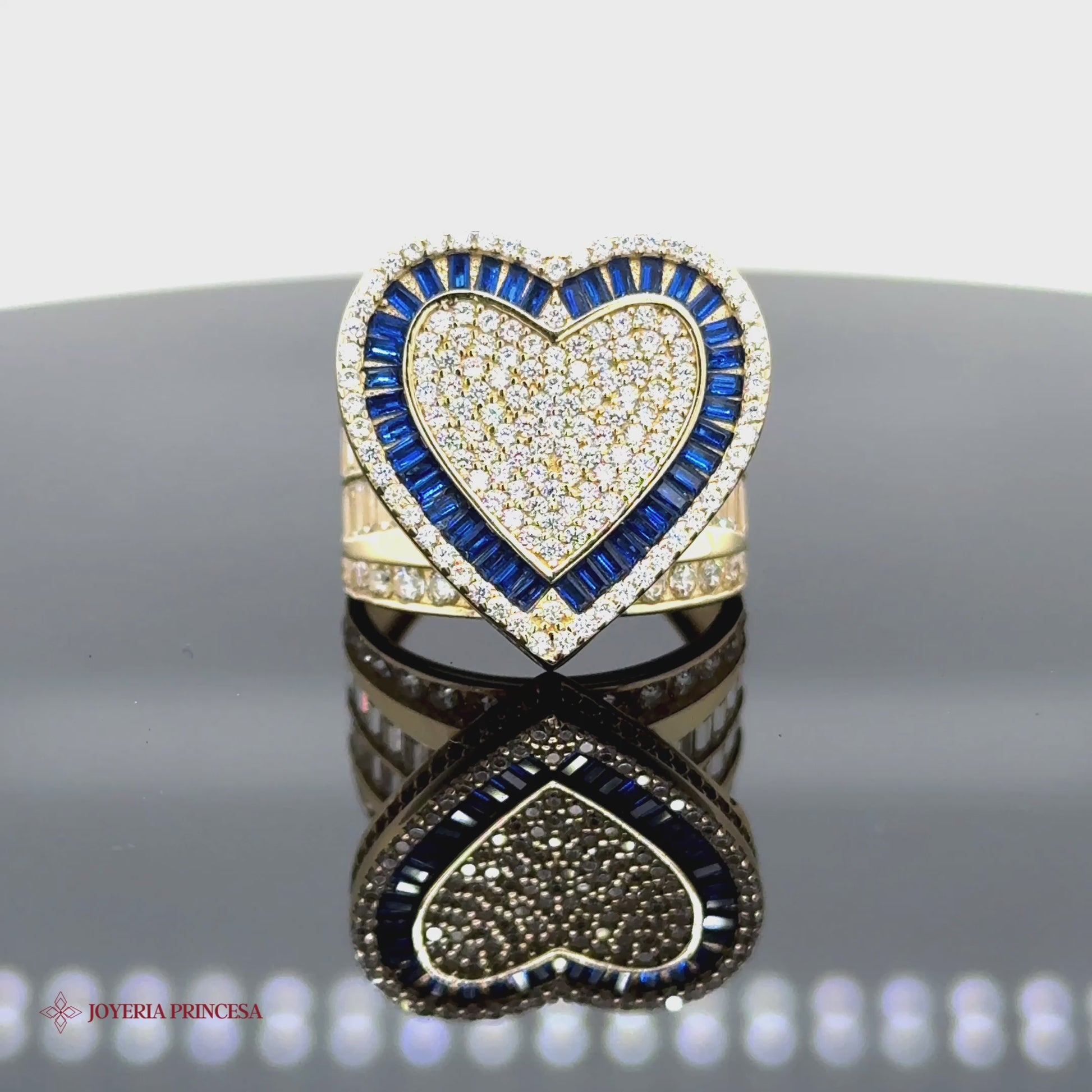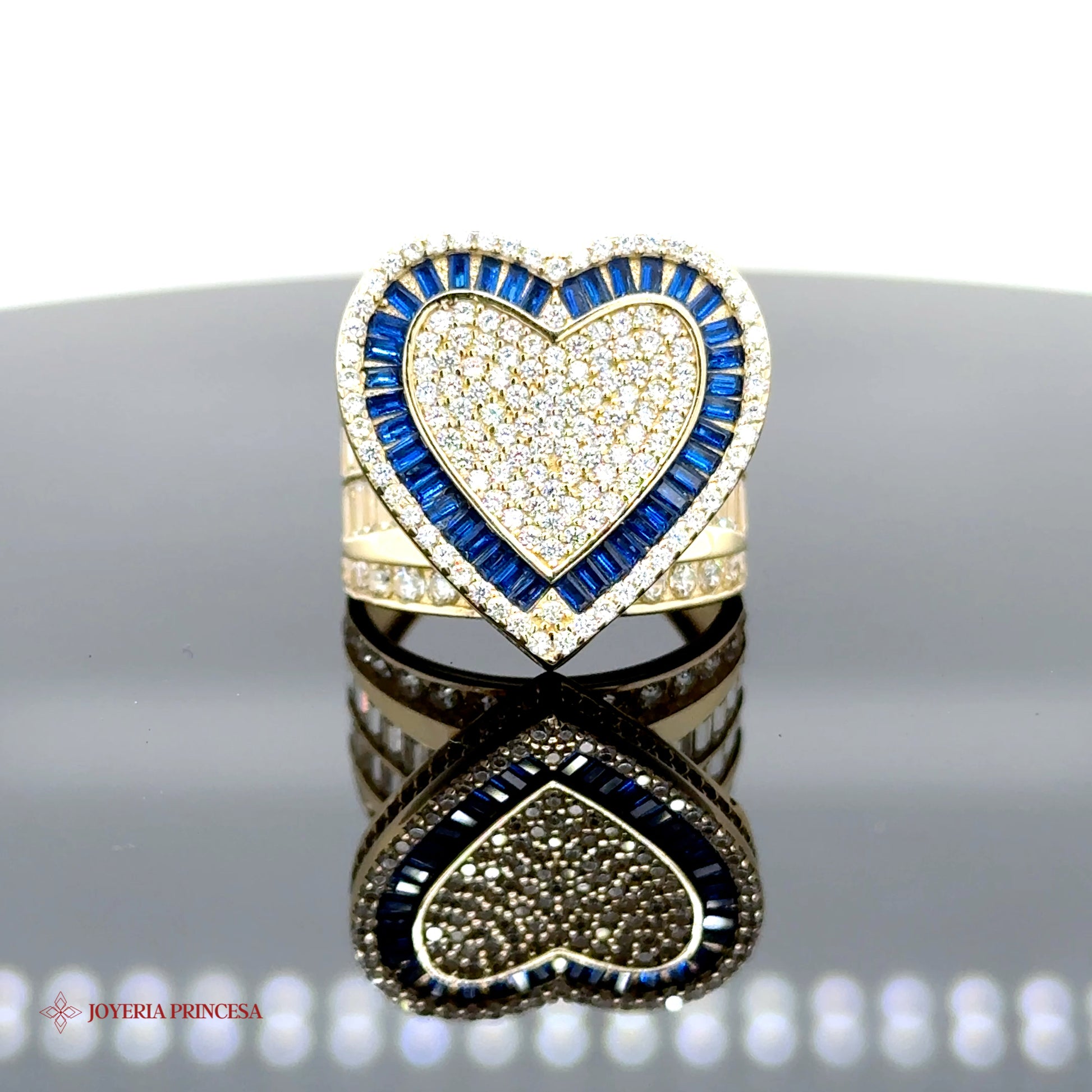 Este impresionante anillo presenta un diseño en forma de corazón adornado con zafiros baguette azules y brillantes circonitas, engastados en oro de 14 quilates.
