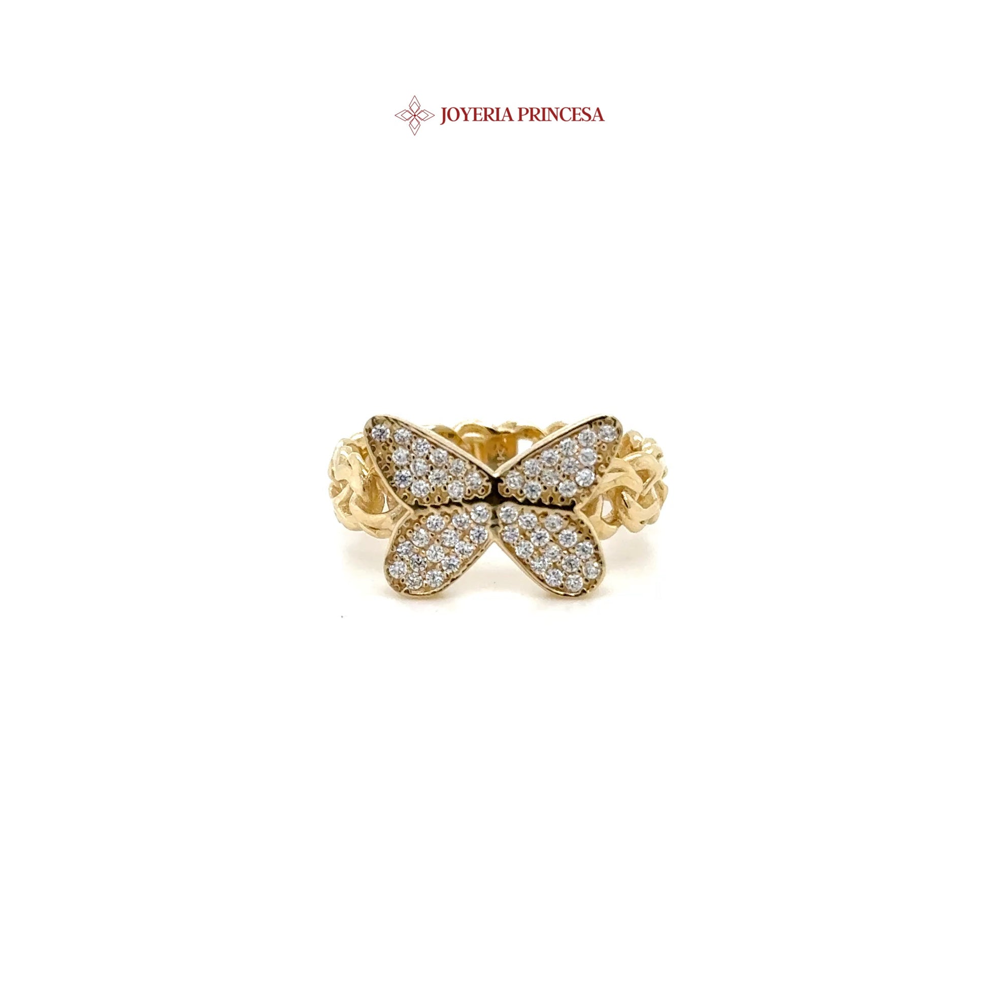 The 14K gold ring features a delicate butterfly design. The band is crafted with a unique chain-like pattern.