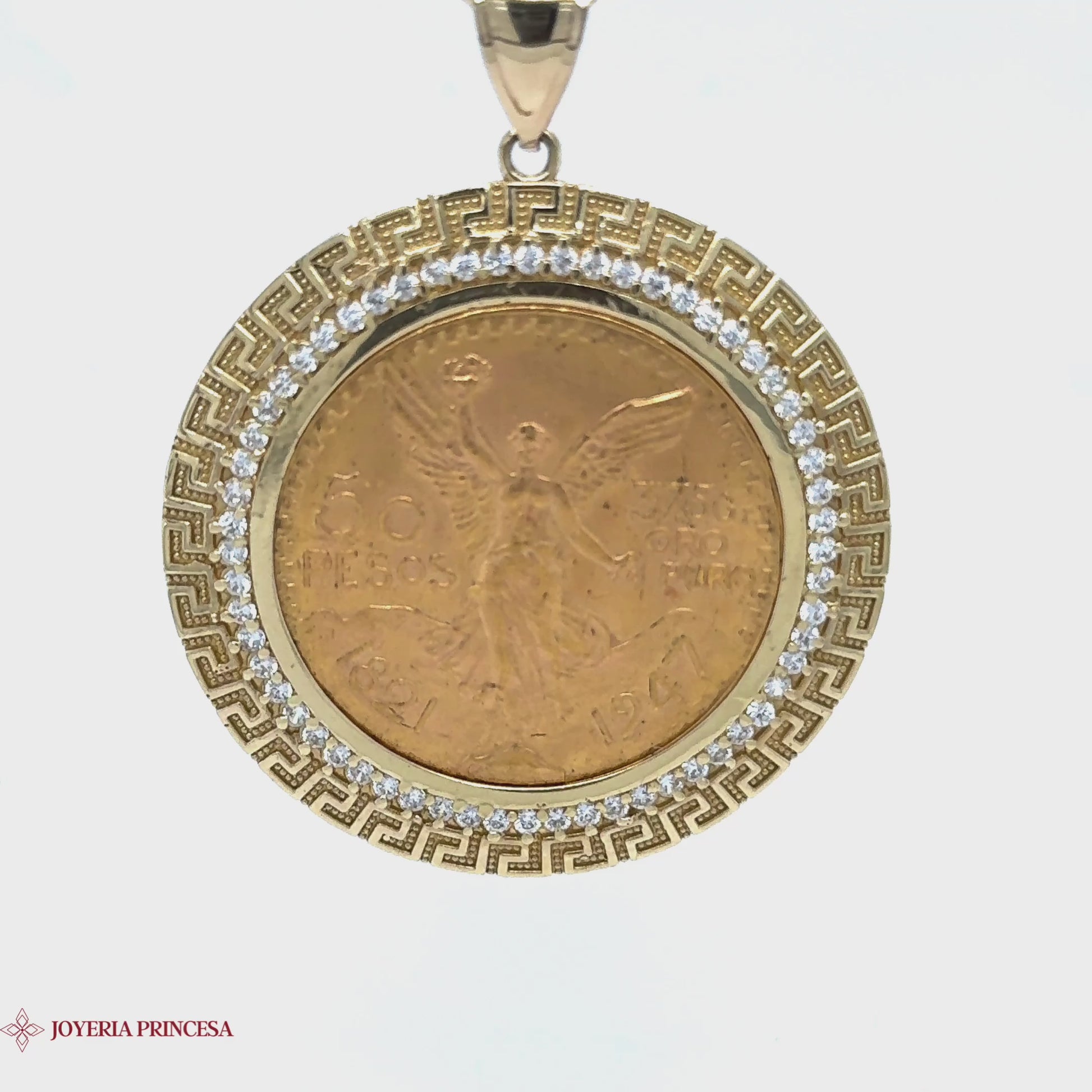 Irradie encanto regio con este colgante de moneda de oro de 22 quilates de 50 pesos recubierto de diamantes. Presenta un marco de llave griega, anverso de Victoria Alada y reverso del Escudo de Armas de México. Características principales: