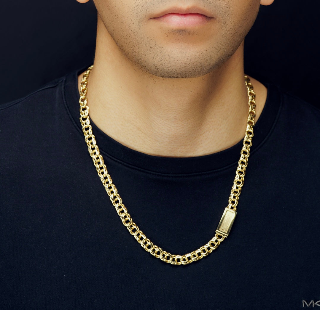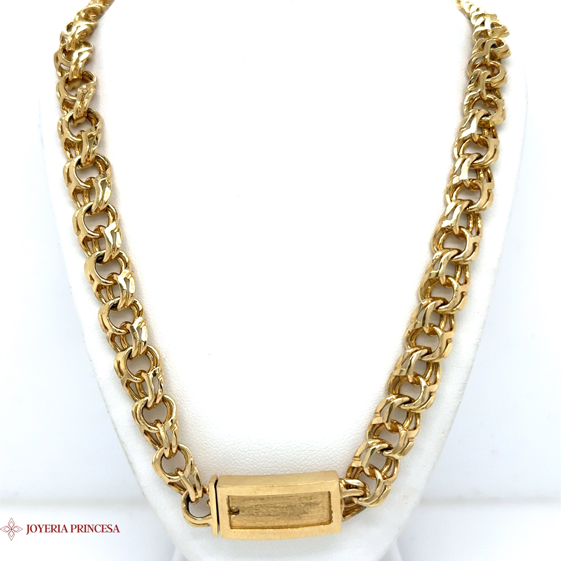 Destaque con la cadena de eslabones Chino de 14 quilates, con eslabones destacados para una estética atrevida. Esta pieza cuenta con un baño de oro de 14 quilates, un cierre de caja seguro, un vibrante color oro amarillo, un acabado pulido y una placa grabable personalizable.