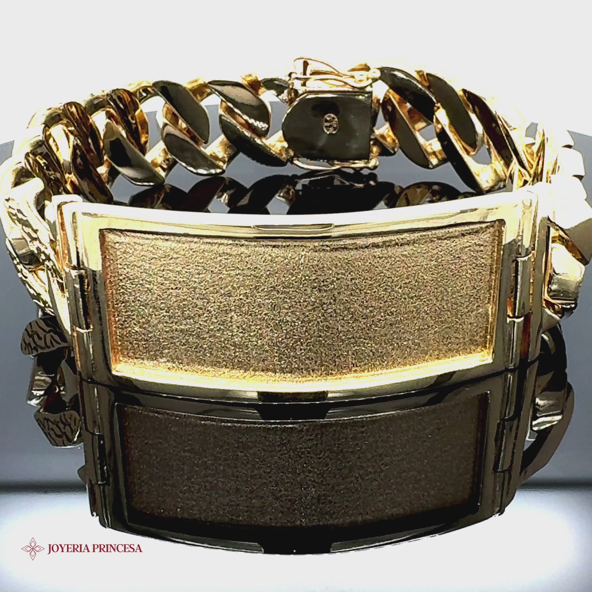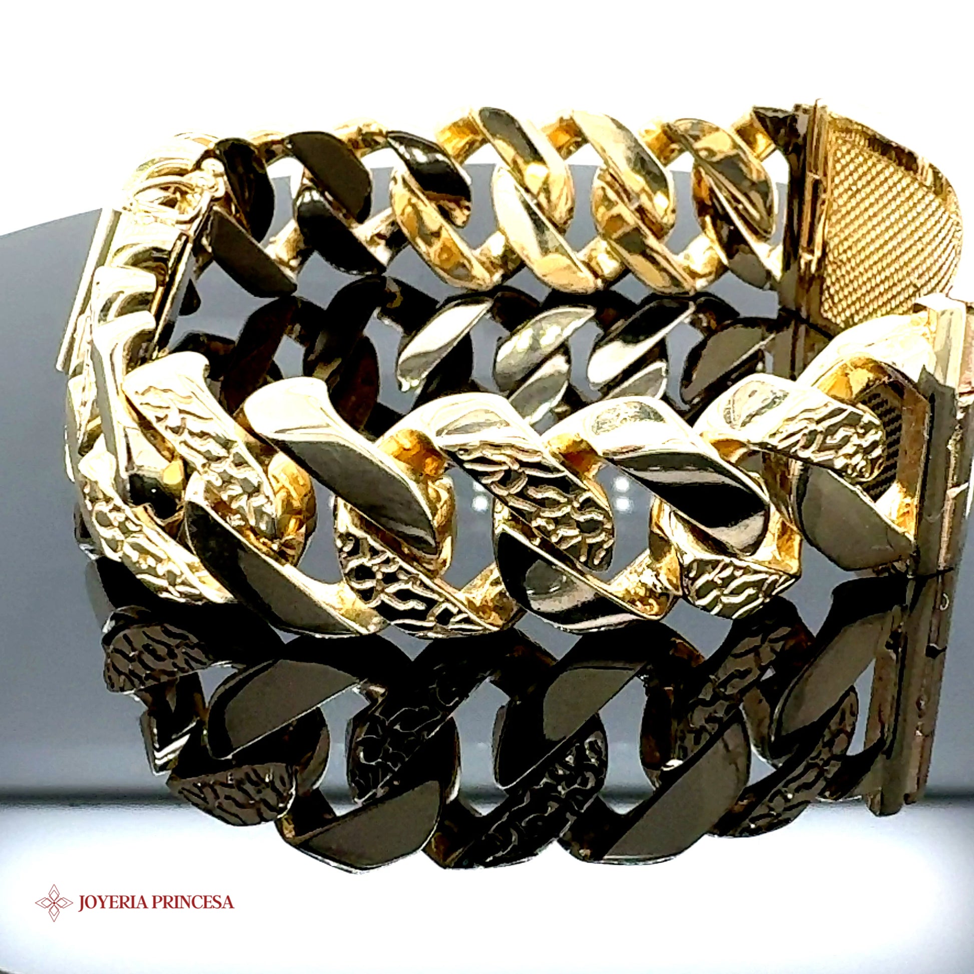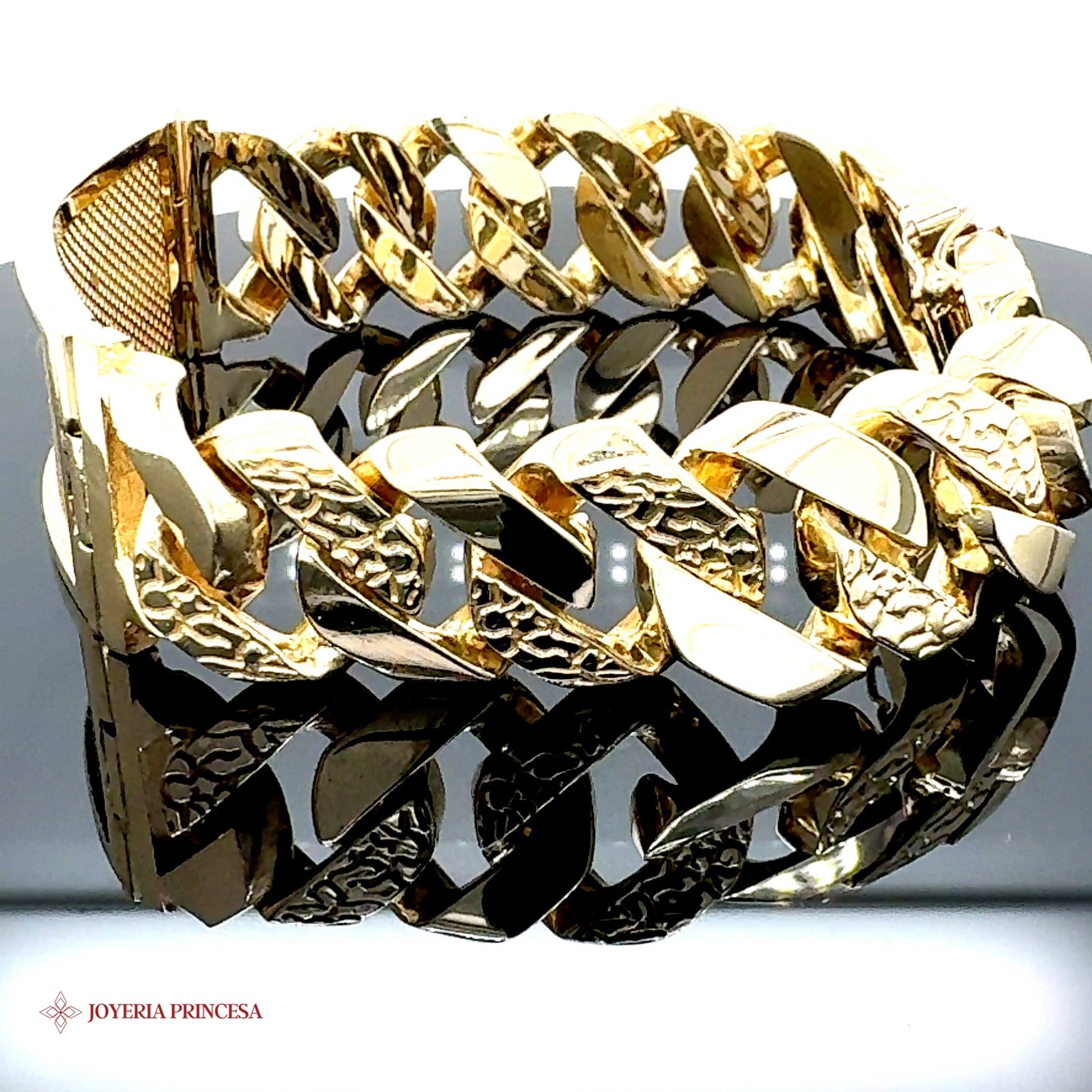 Lujosa pulsera de eslabones de pepita cubana de 14 quilates, con un peso de 140,6 gramos, combina de forma única el diseño de pepita con el clásico eslabón cubano. Características principales: