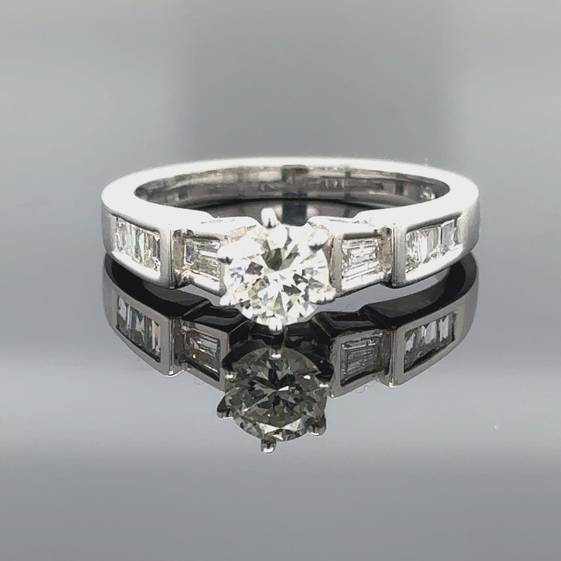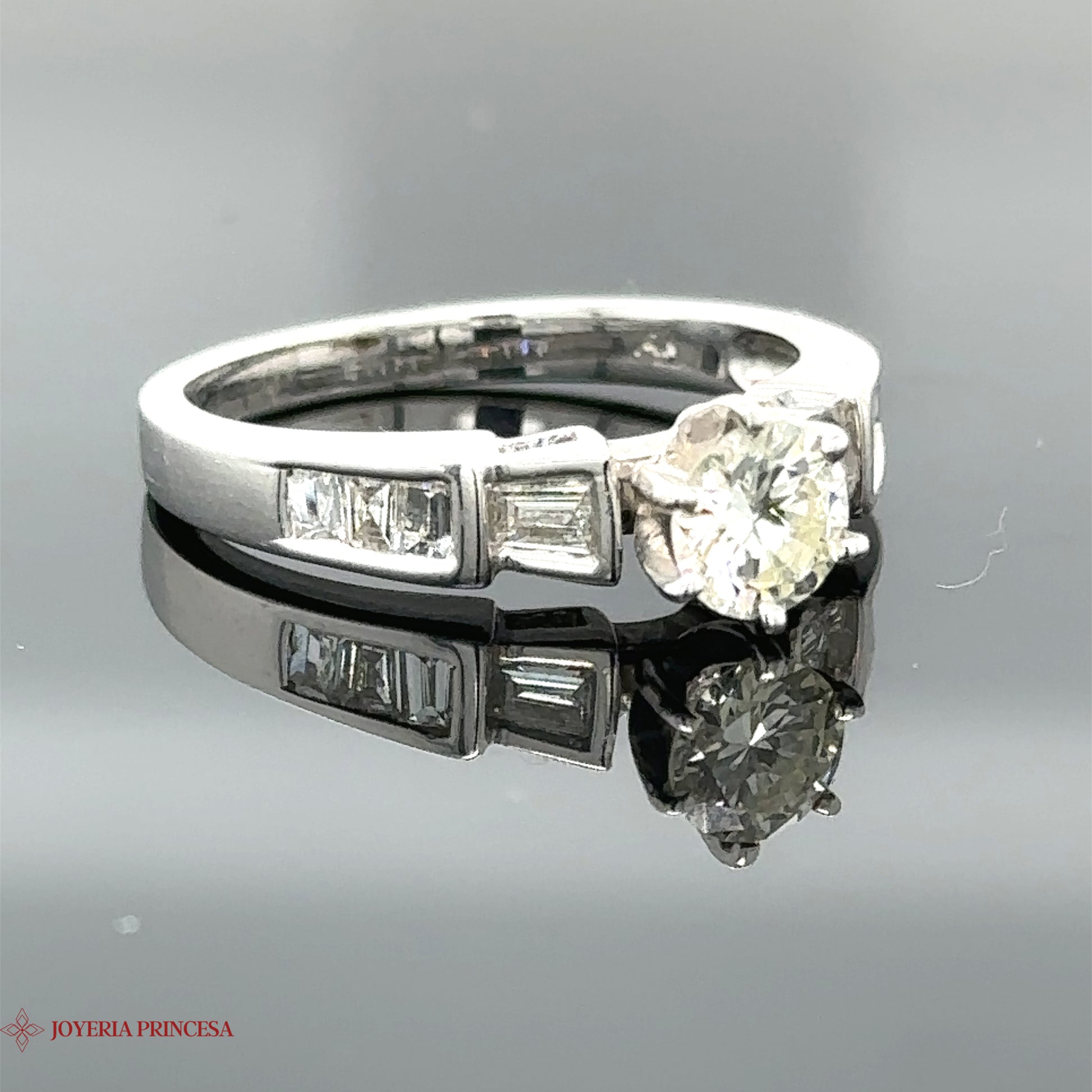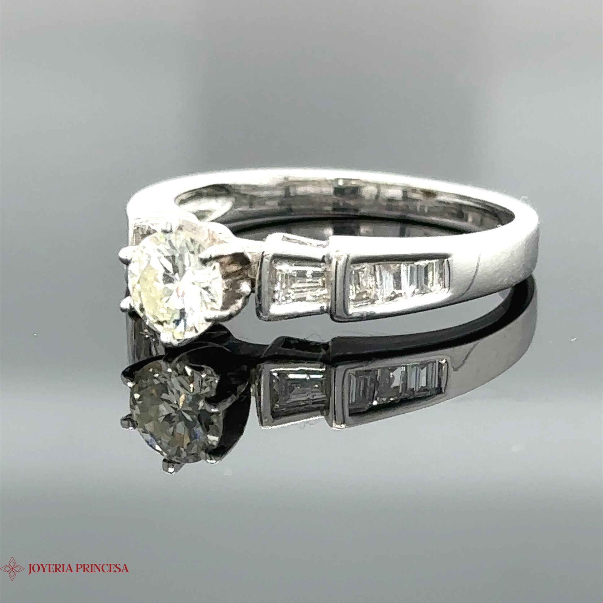 La elegancia se une a la sofisticación en nuestro anillo de compromiso de diamantes de oro blanco de 14 quilates. El resplandeciente diamante principal, las delicadas garras y los elegantes diamantes baguette crean un símbolo de amor y compromiso con un atractivo atemporal.