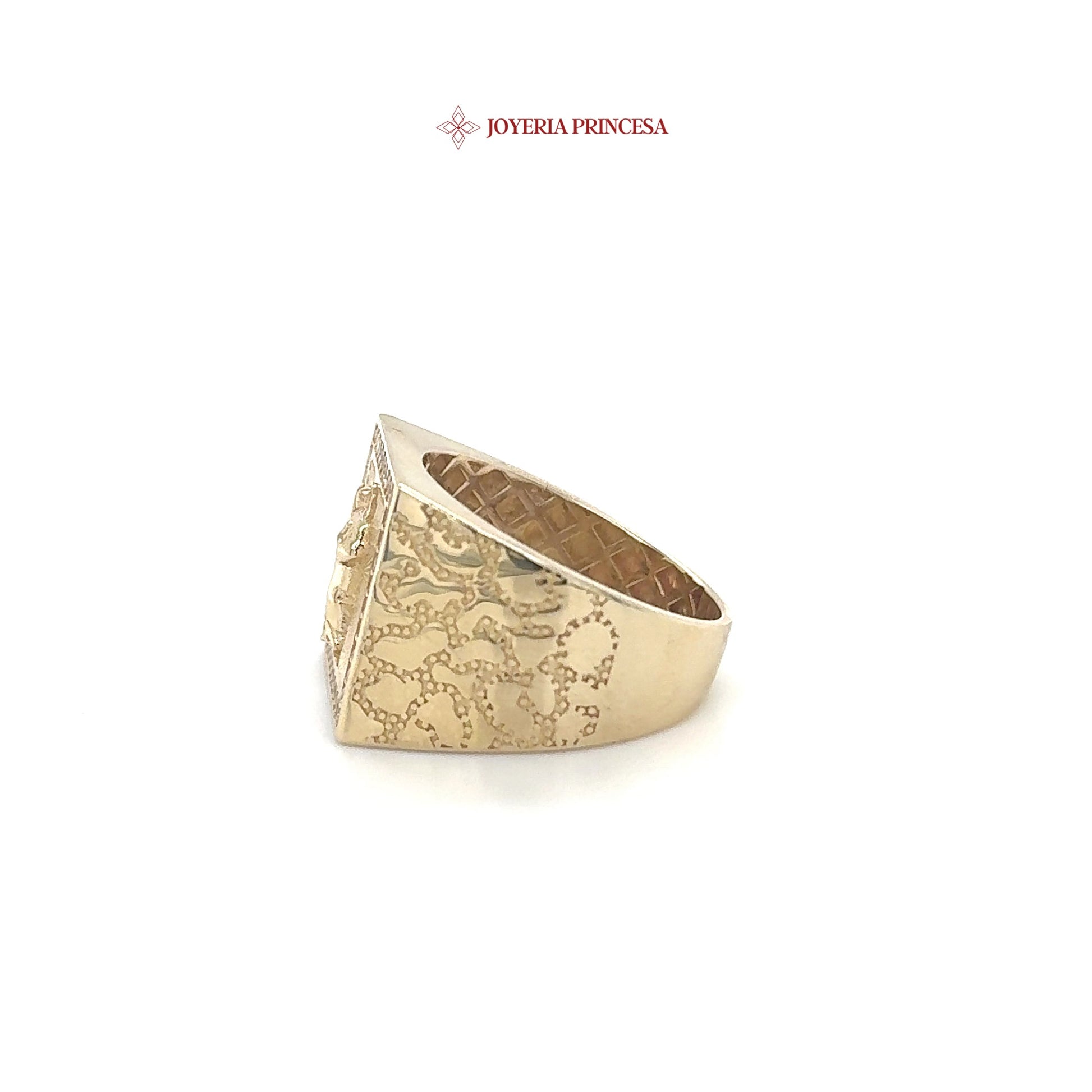 The 14K gold ring features an intricate design with a central religious figure. It is framed by a border of sparkling stones.
