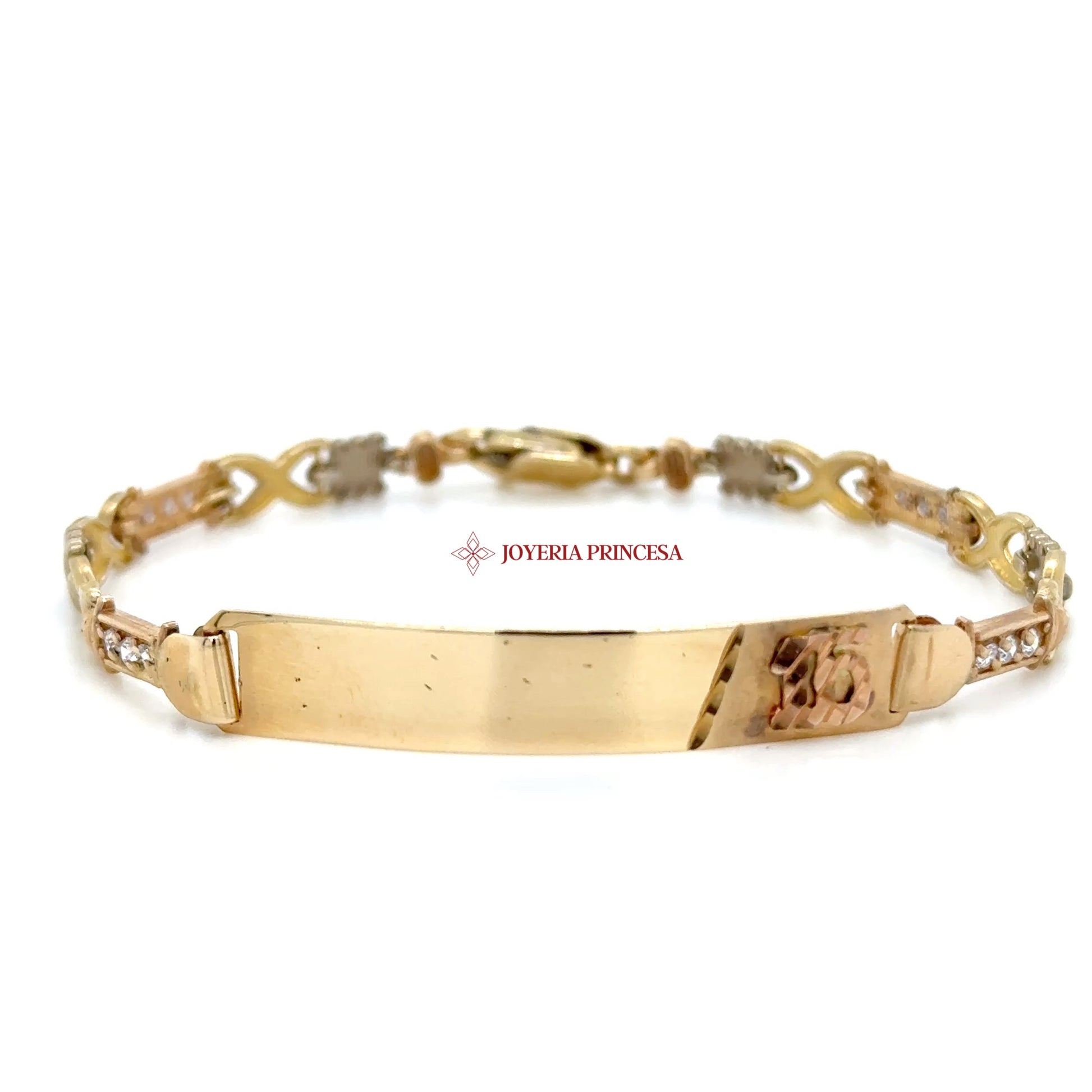 This exquisite 14K bracelet features a delicate infinity design interspersed with luminous cubic zirconias, offering a touch of sophistication to any ensemble. - 14K gold construction - Elegant infinity design - Accented with cubic zirconias