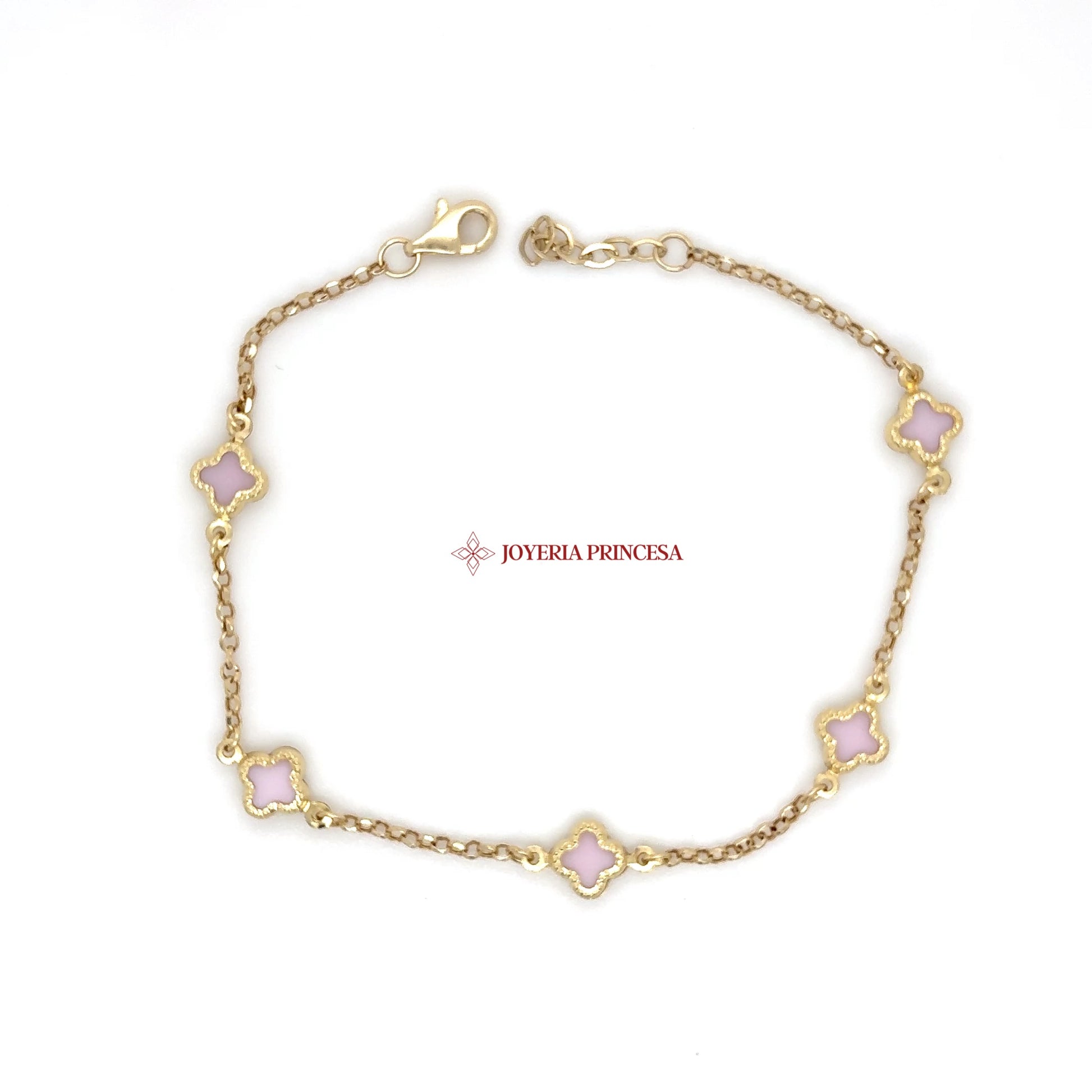 This exquisite 14K gold bracelet features delicate floral motifs adorned with soft pink cubic zirconias, offering a graceful touch to any ensemble.