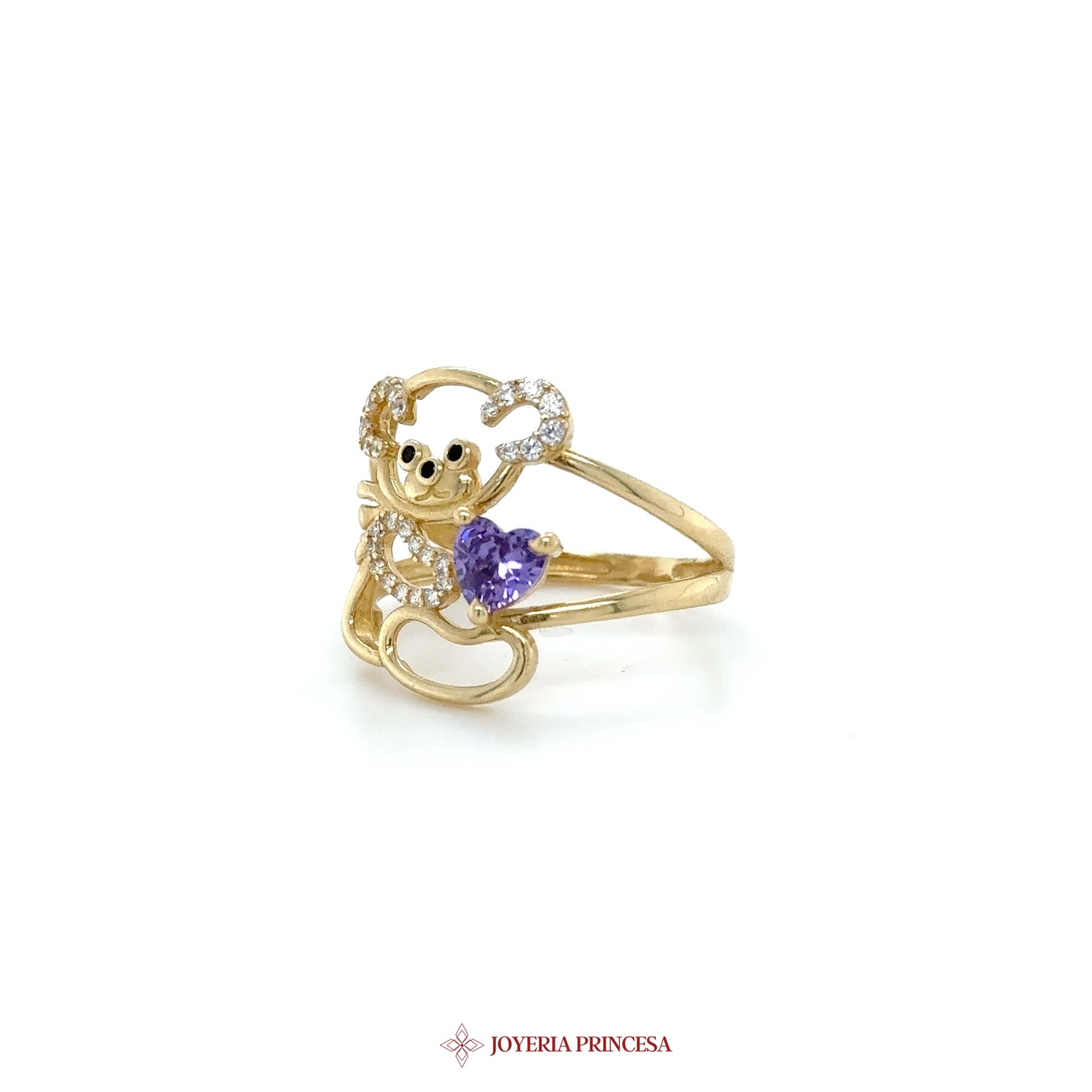ES: Adorable anillo de oro de 14K con motivo de oso que presenta una amatista en forma de corazón y zirconias brillantes • Diseño único de oso • Centro de amatista en forma de corazón • Perfecto para una elegancia juguetona