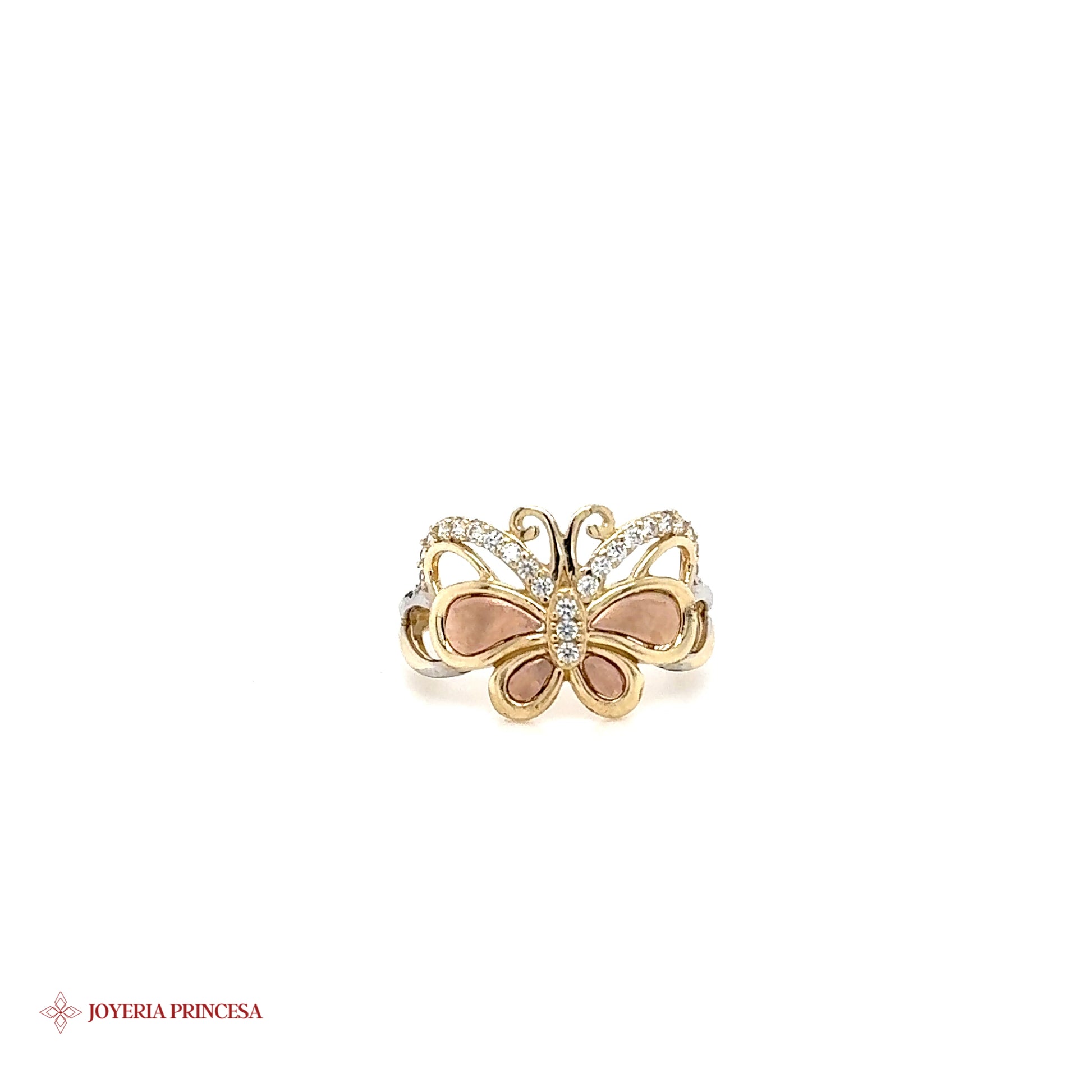 Elegante anillo de mariposa de 14 quilates con intrincados detalles en oro rosa y amarillo. Con detalles de circonitas.