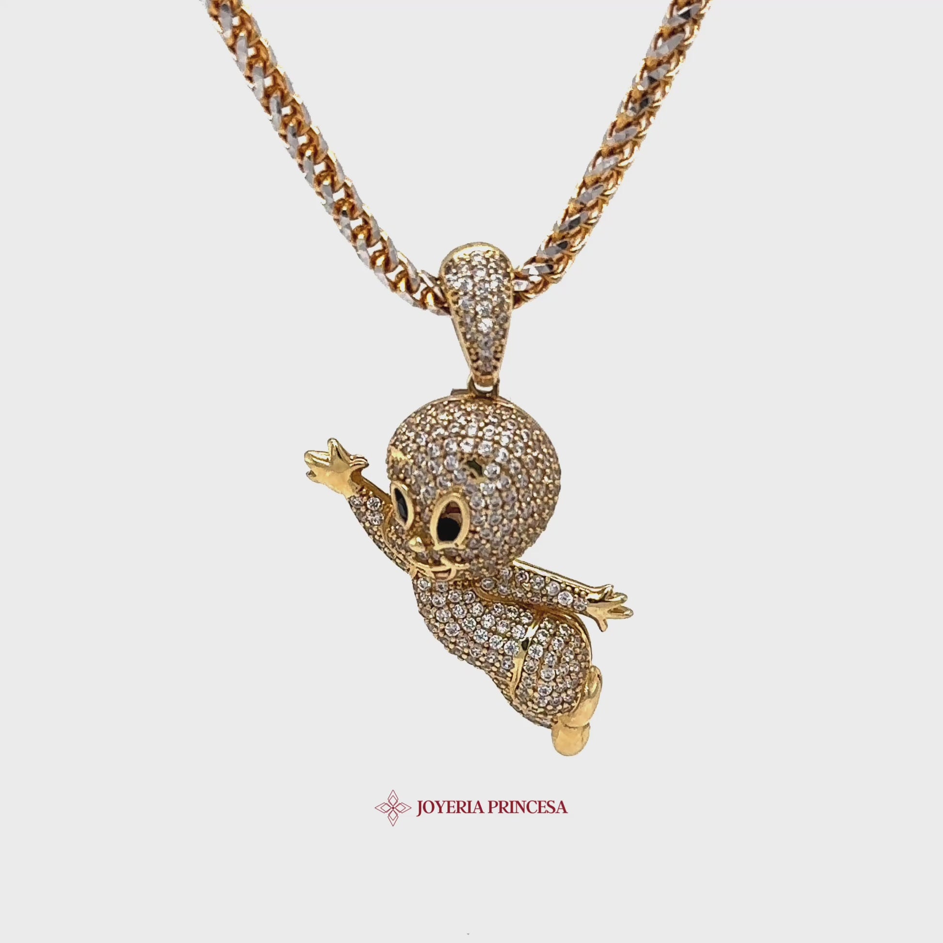 Este encantador colgante de oro de 14 quilates presenta a Casper, adornado con piedras de circonita. Una adición encantadora a su colección de joyas.