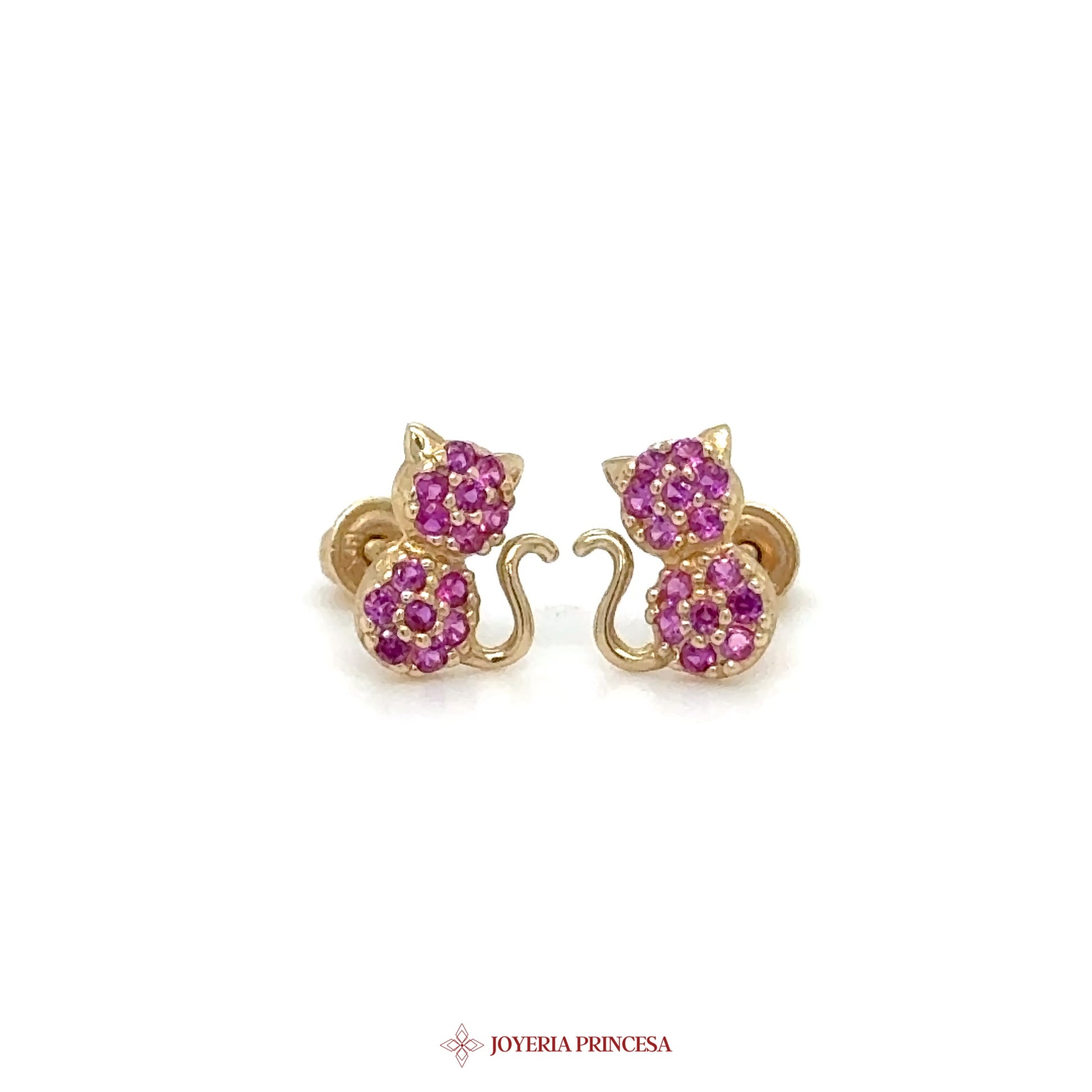 14K Gold Cat Stud Earrings with Pink Stones