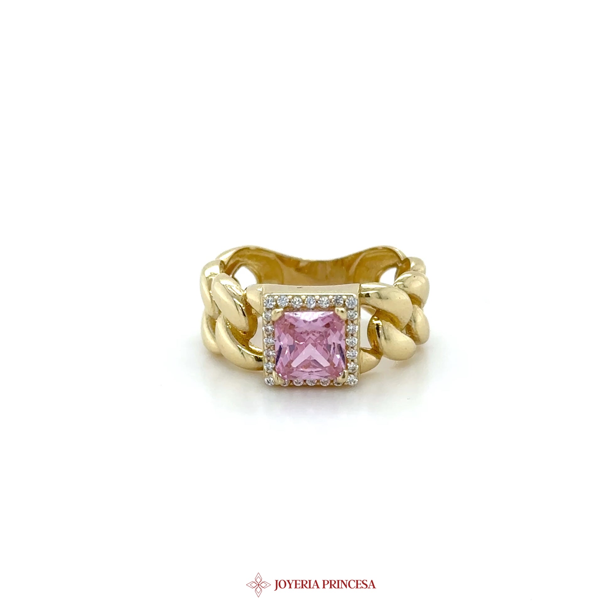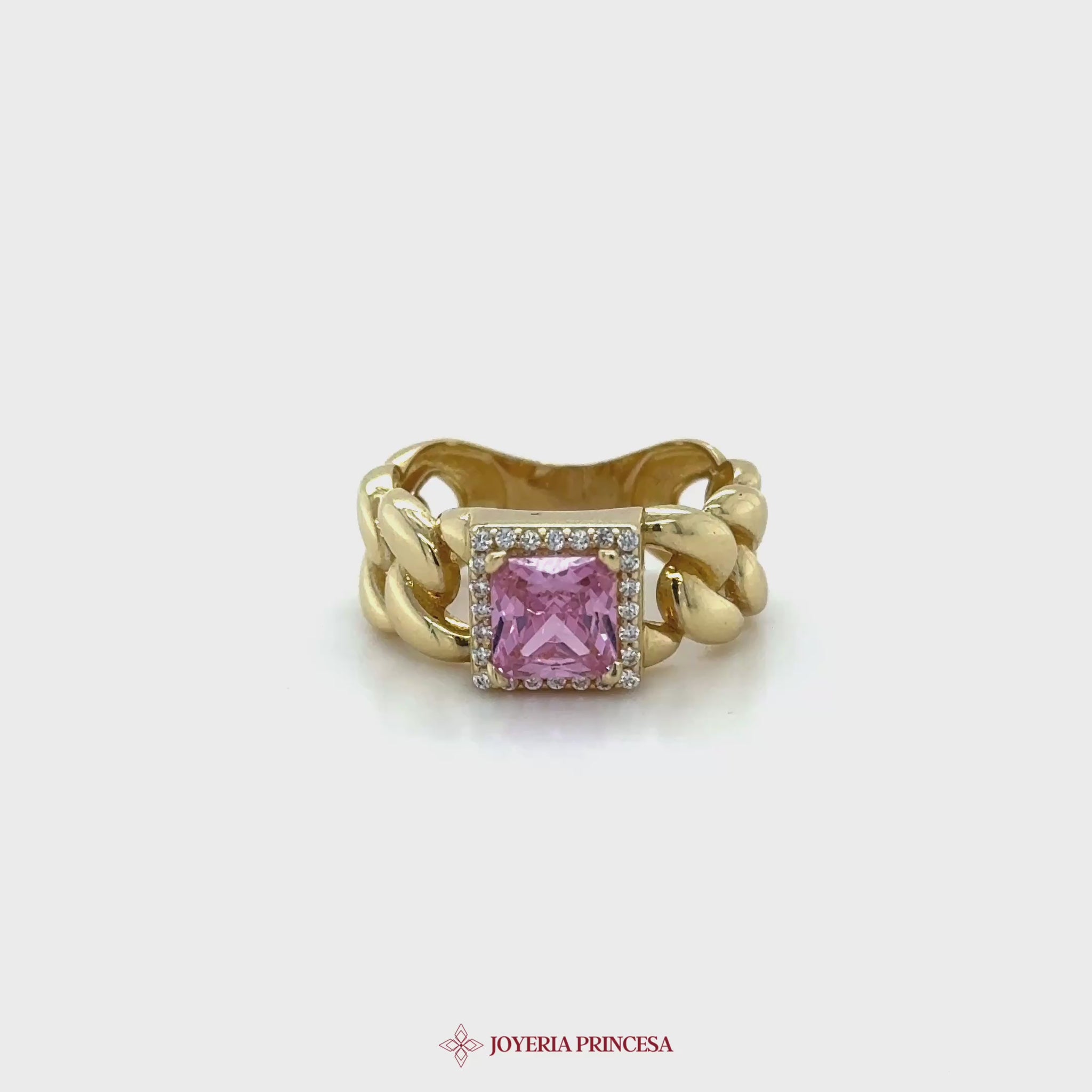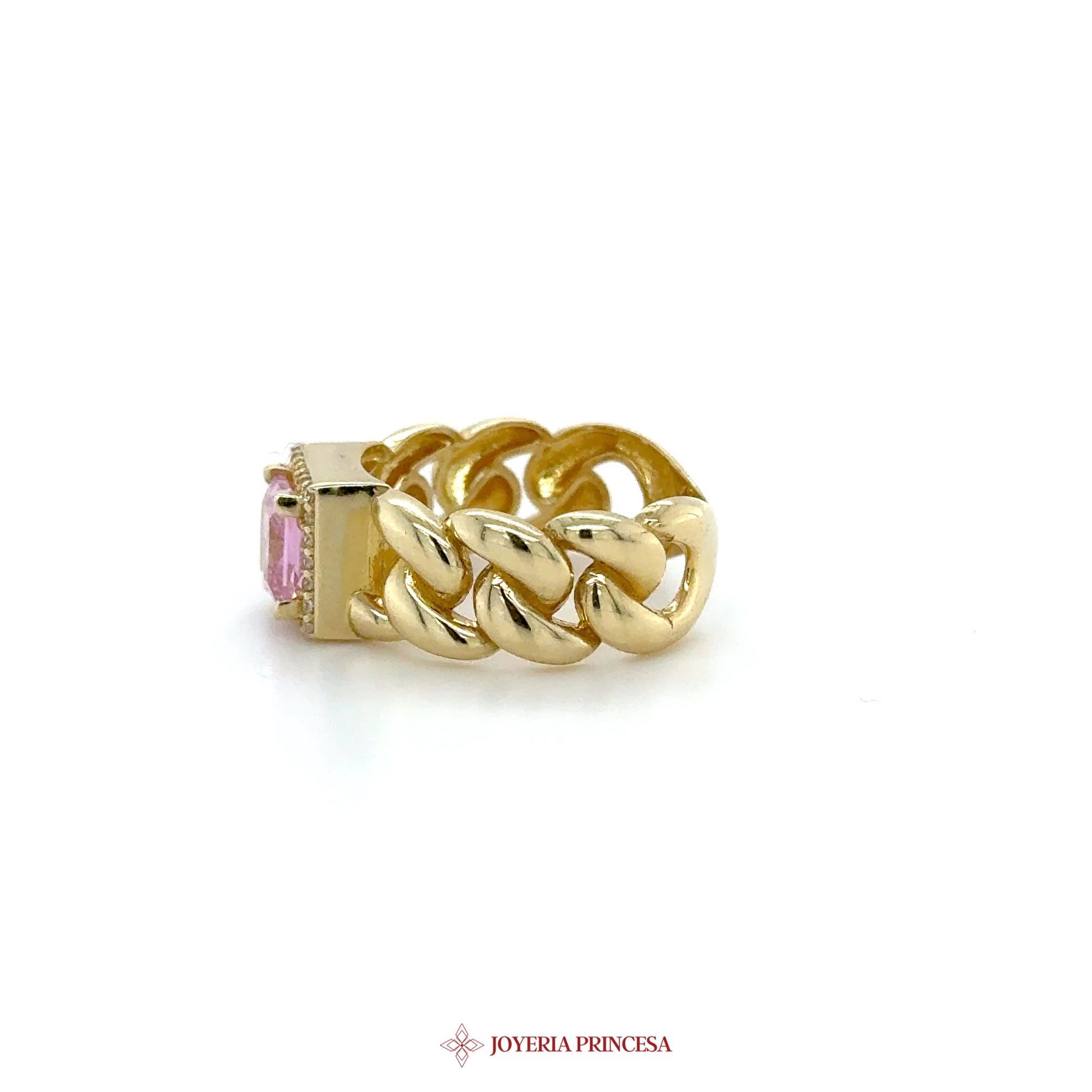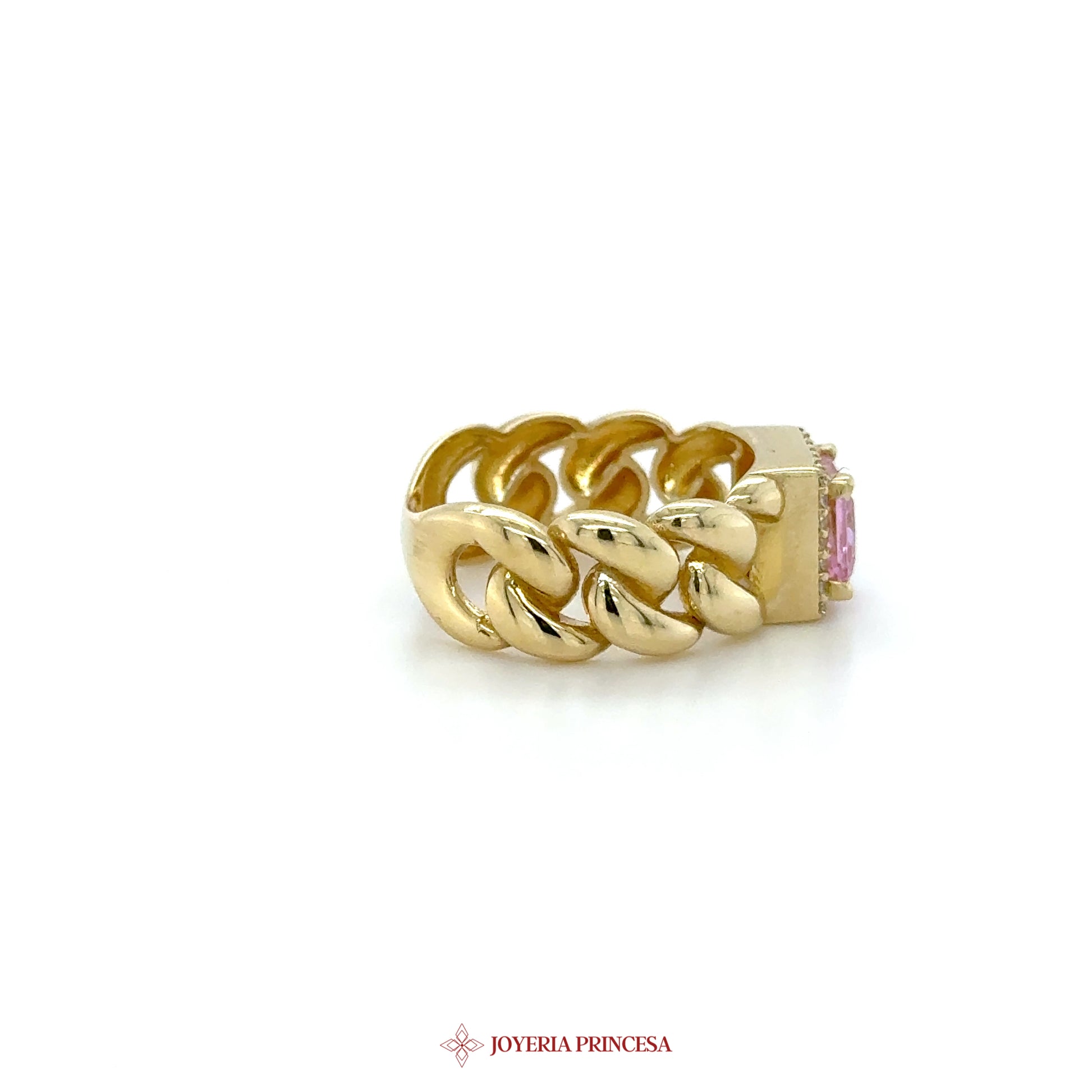 ES: Este impresionante anillo de eslabones gruesos en oro de 14K presenta una vibrante piedra rosa, perfecta para añadir un toque de color a cualquier atuendo. • Diseño elegante de eslabones gruesos • Piedra rosa llamativa • Material duradero de oro de 14K