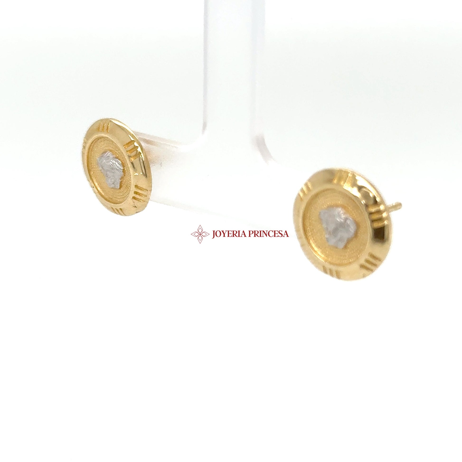 ES: Estos impresionantes pendientes de botón de oro de 14K presentan un exclusivo motivo de moneda adornado con circonitas cúbicas brillantes para un toque de elegancia.