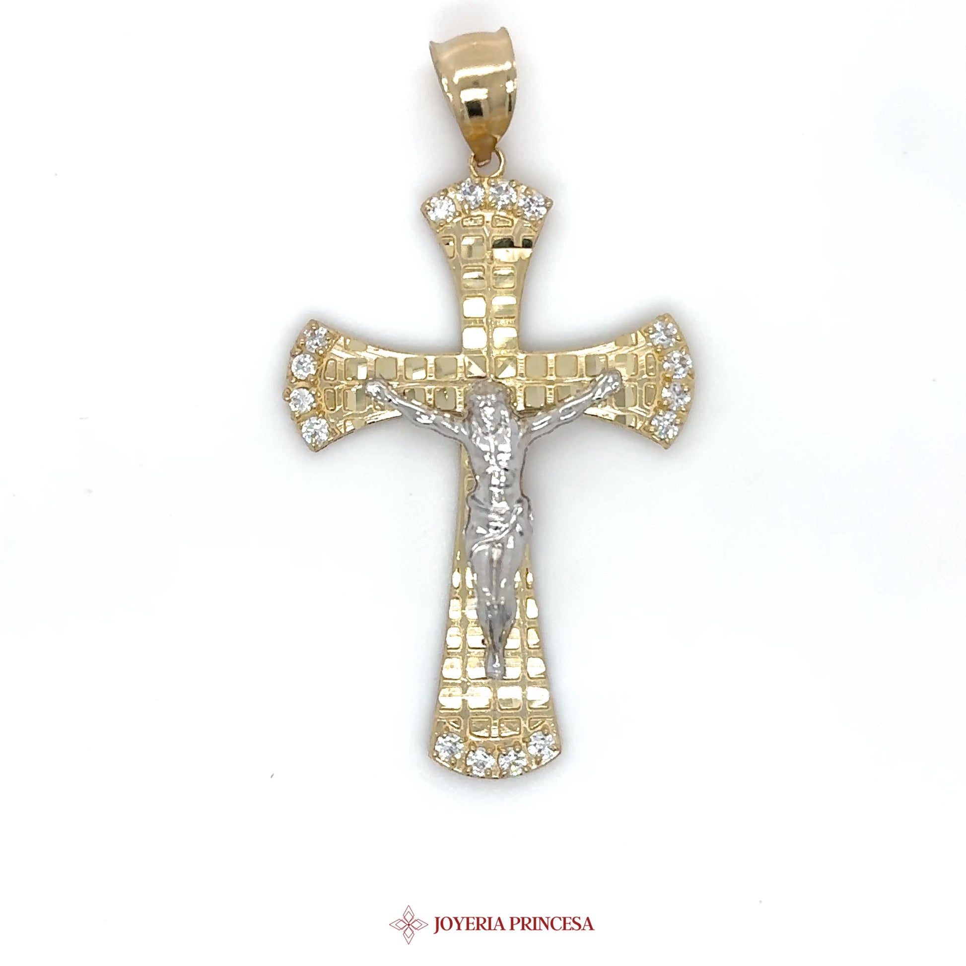 ES: Un impresionante colgante de cruz de oro de 14K adornado con piedras de CZ brillantes. • Diseño elegante con un acabado texturizado • Perfecto para el uso diario o ocasiones especiales • Una pieza significativa para atesorar.