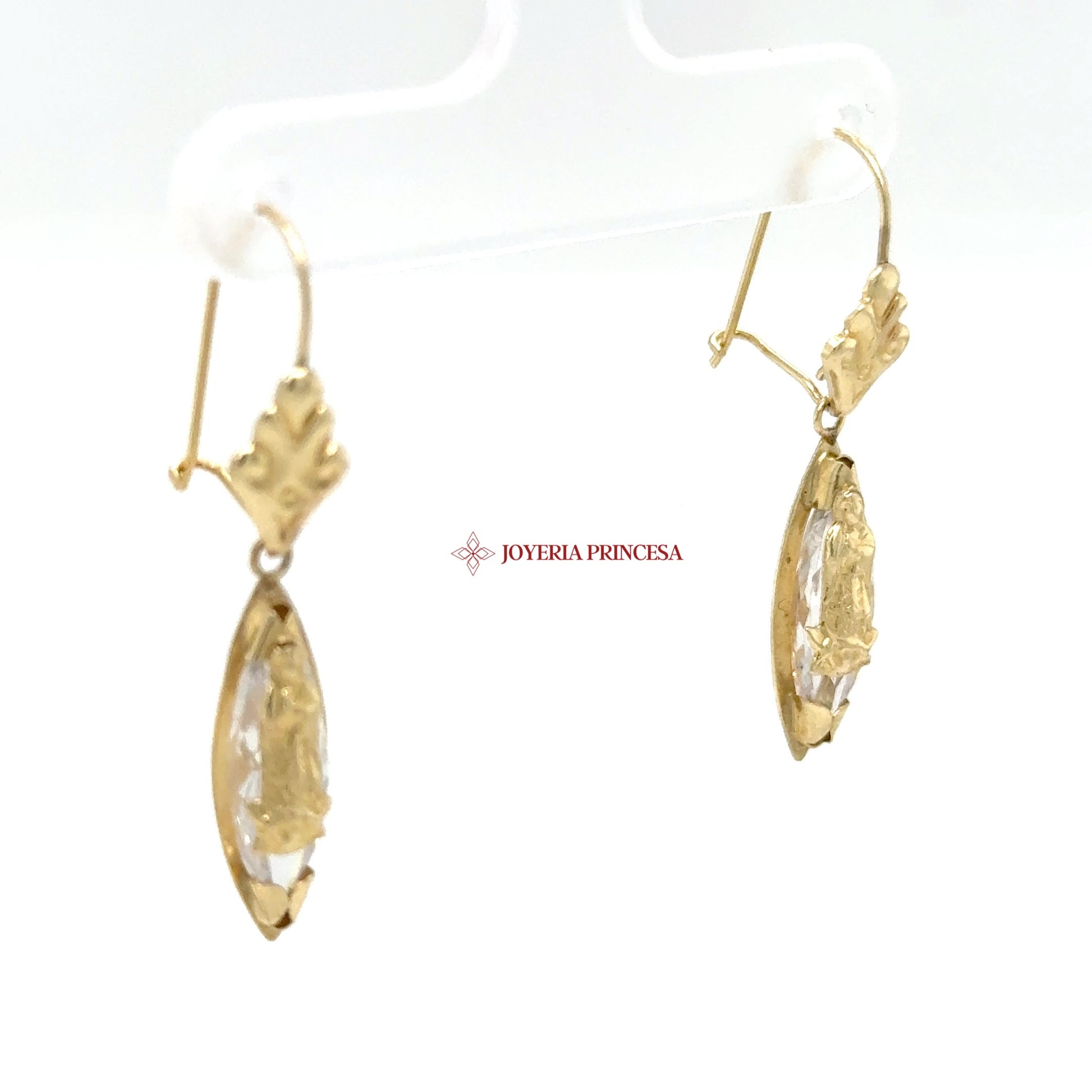 EN: These elegant 14K gold dangle Virgen de Guadalupe earrings feature a beautiful floral motif and sparkling cubic zirconias. ES: Estos elegantes pendientes colgantes de 14K presentan un hermoso motivo floral y brillantes circonitas cúbicas.