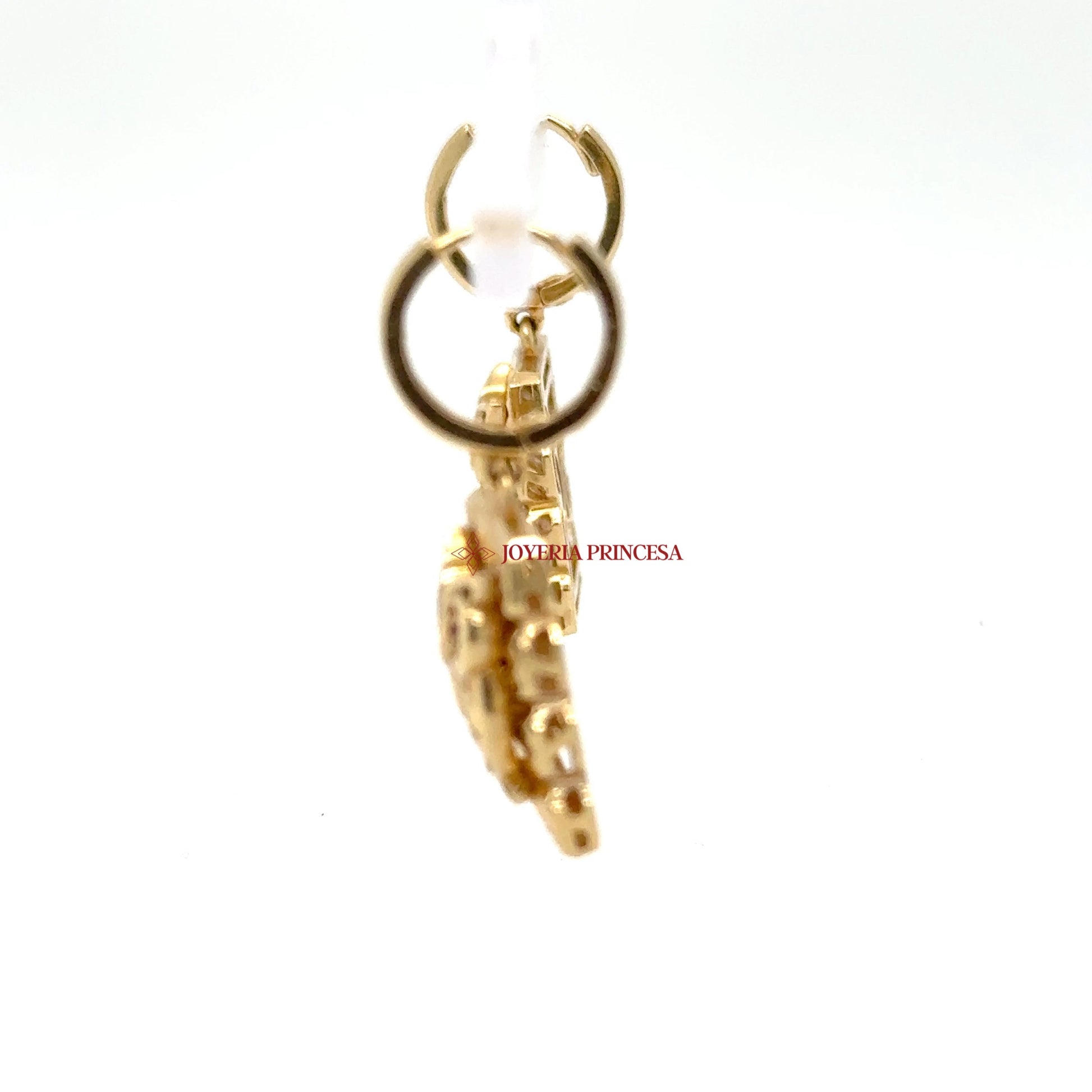 EN: These elegant 14K gold dangle earrings feature intricate decorative designs with sparkling cubic zirconia accents.