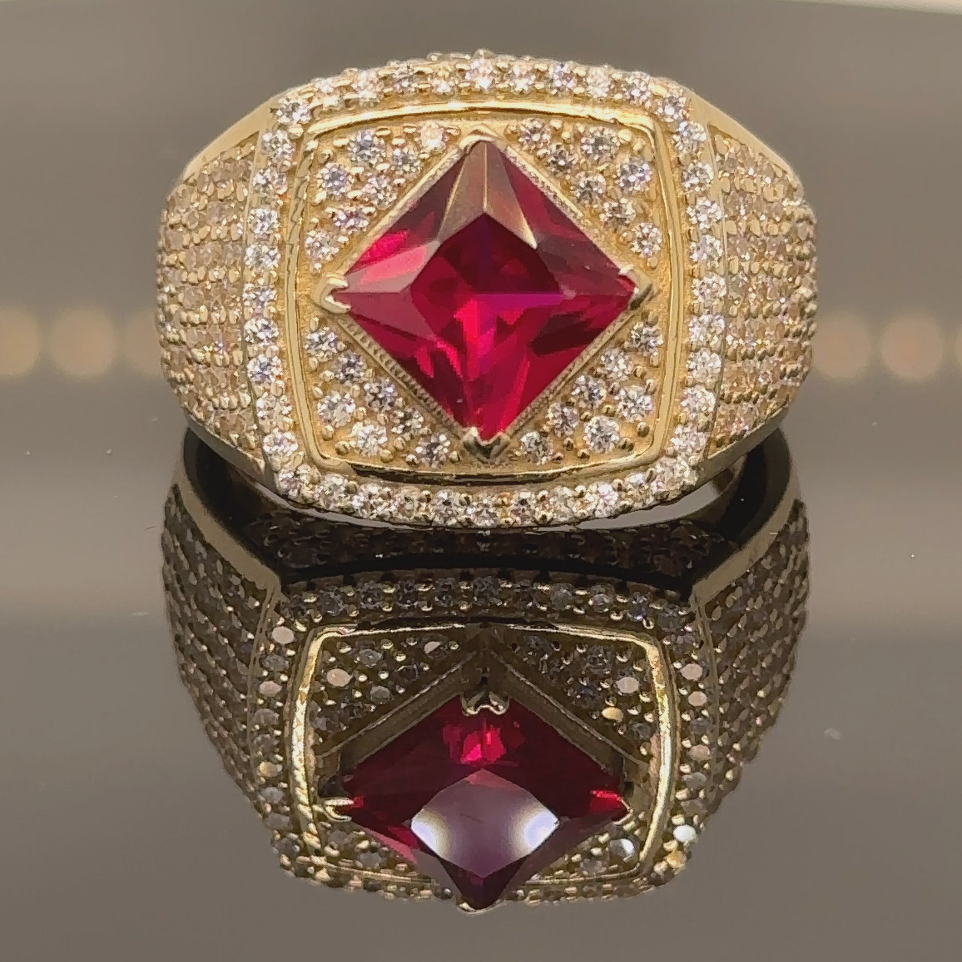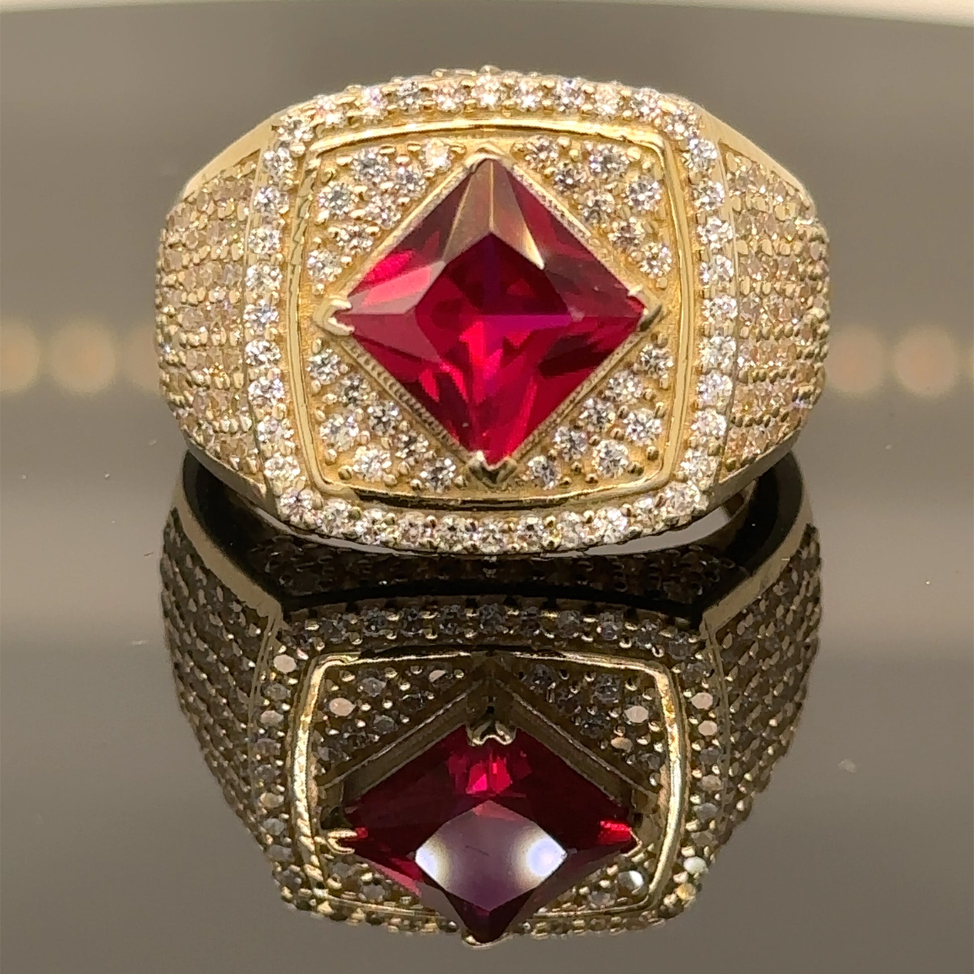 Elaborado en exquisito oro de 14 quilates, este anillo de rubí luce un rico centro de rubí, brillantes detalles de circonita y un luminoso acabado pulido: