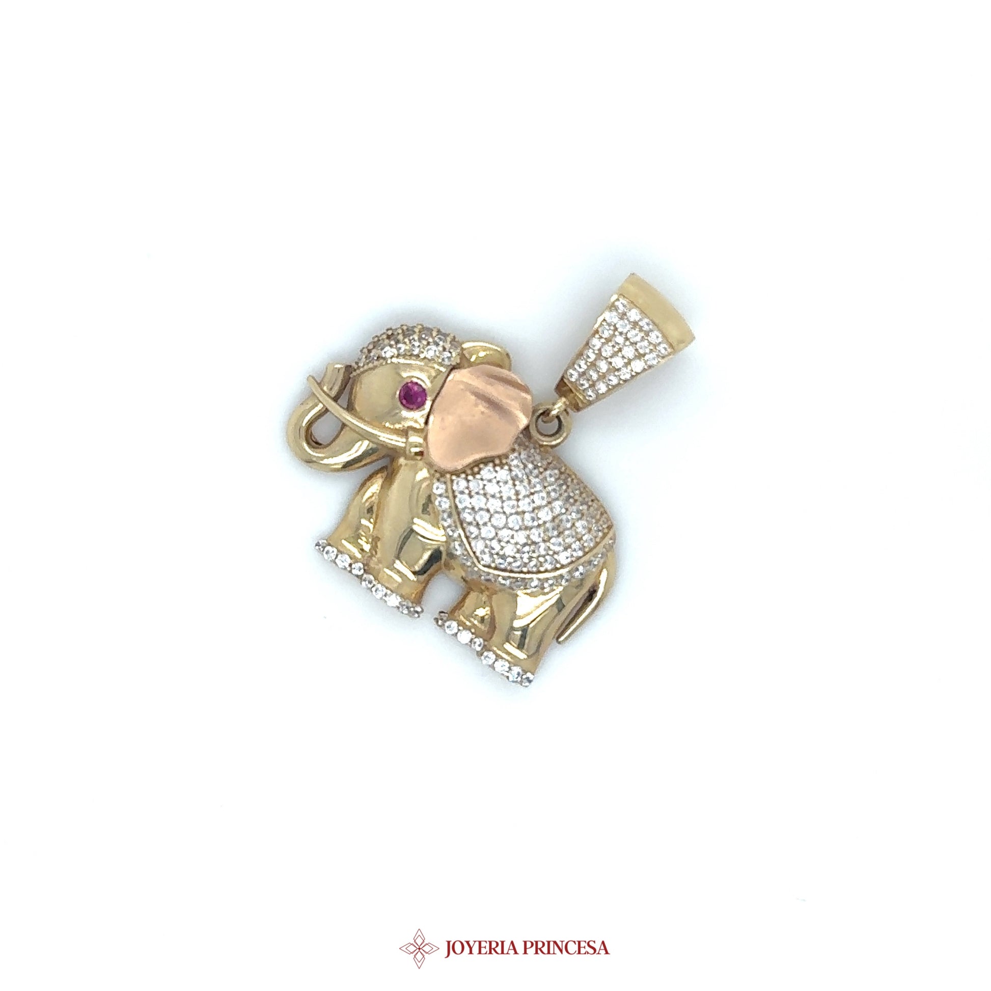 ES: Adorna tu look con este encantador colgante de elefante en oro de 14K con CZ brillantes y un acento de rubí. • Elegante motivo de elefante • Oro de 14K de alta calidad • Perfecto para cualquier ocasión