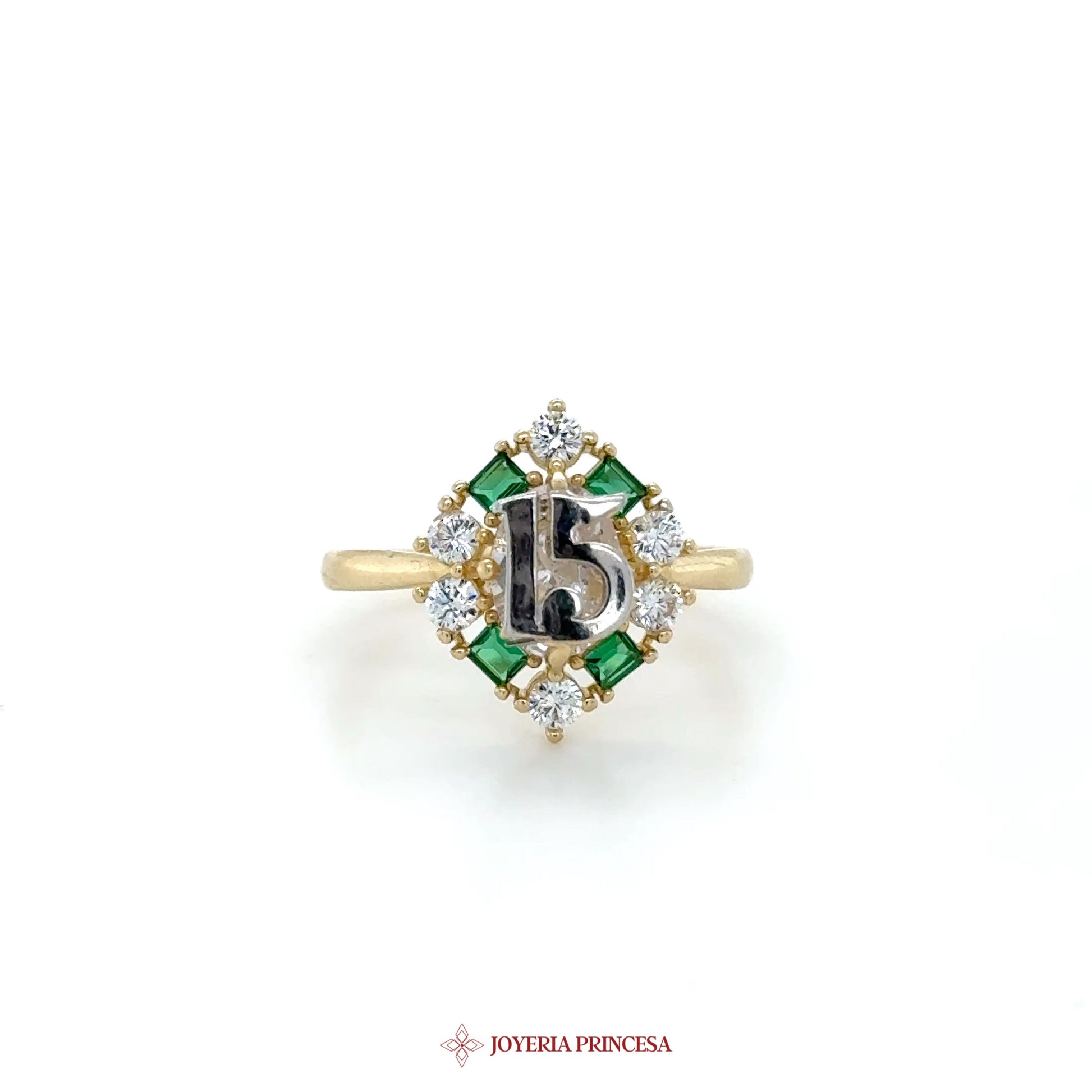 ES: Celebra momentos especiales con este impresionante anillo que presenta acentos de esmeralda y brillantes CZ. • Fabricado en oro de 14K • Motivo de número único • Perfecto para conmemorar hitos