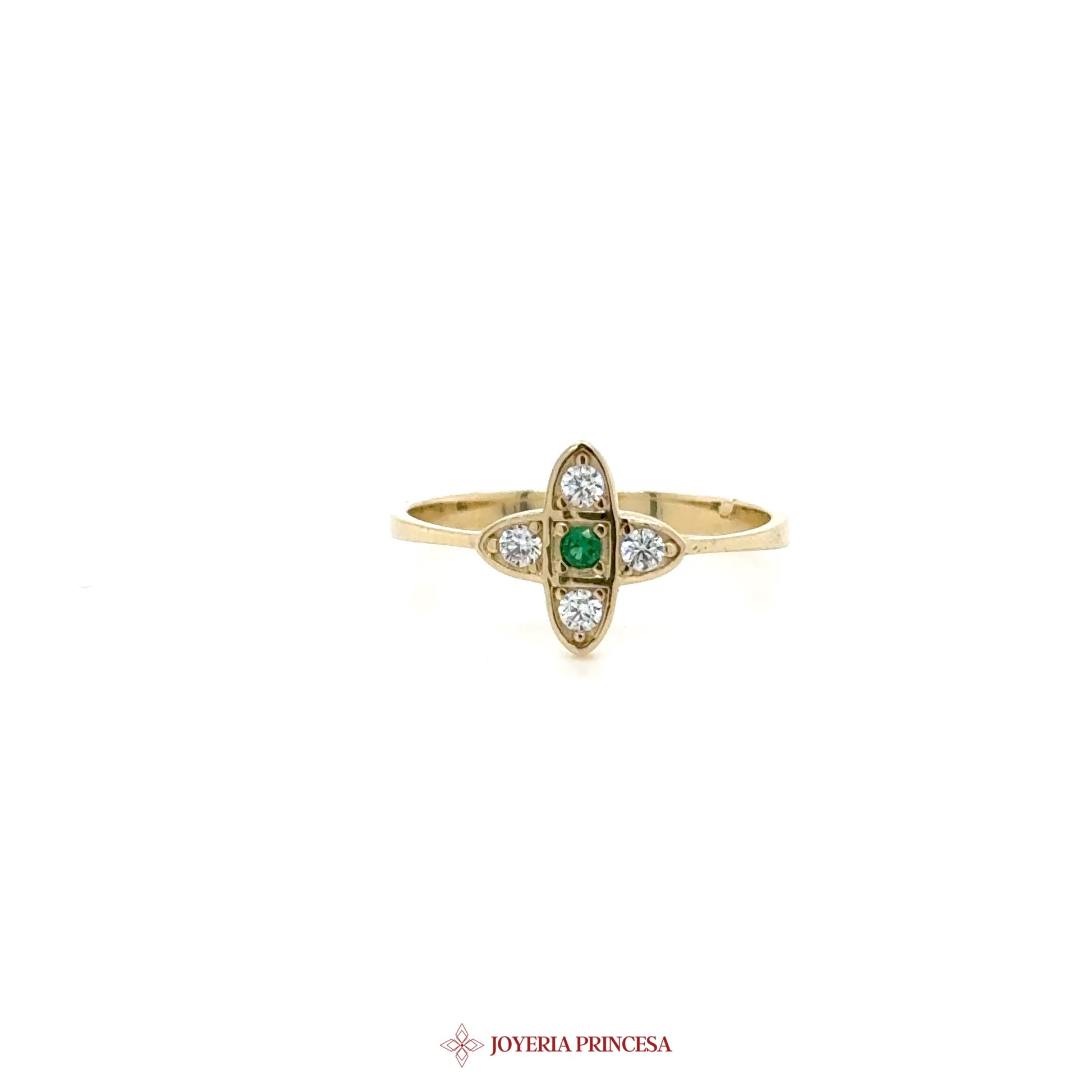 ES: Este exquisito anillo de oro de 14K presenta una vibrante piedra verde rodeada de acentos de CZ brillantes. • Diseño de motivo elegante • Perfecto para el uso diario • Regalo ideal para ocasiones especiales