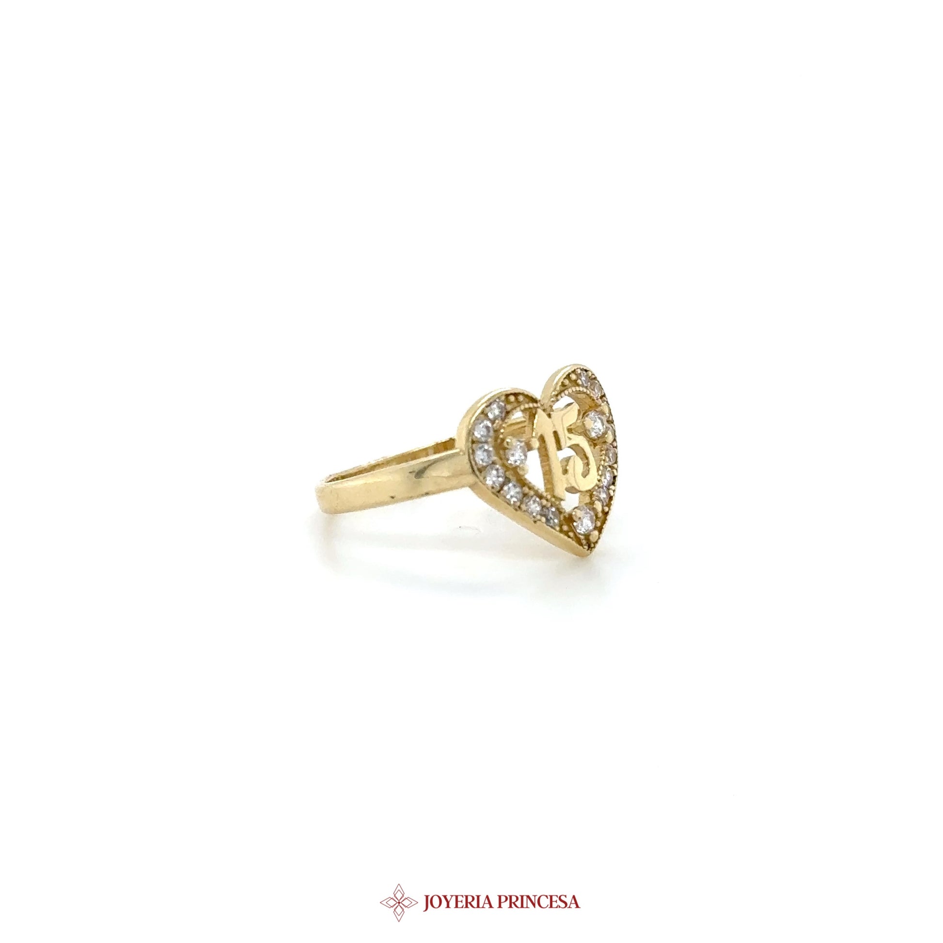EN: Celebrate your special moment with this charming heart-shaped quinceanera ring adorned with sparkling zirconias. • Crafted in 14K gold • Heart motif for a sentimental touch • Perfect for commemorating your 15th birthday