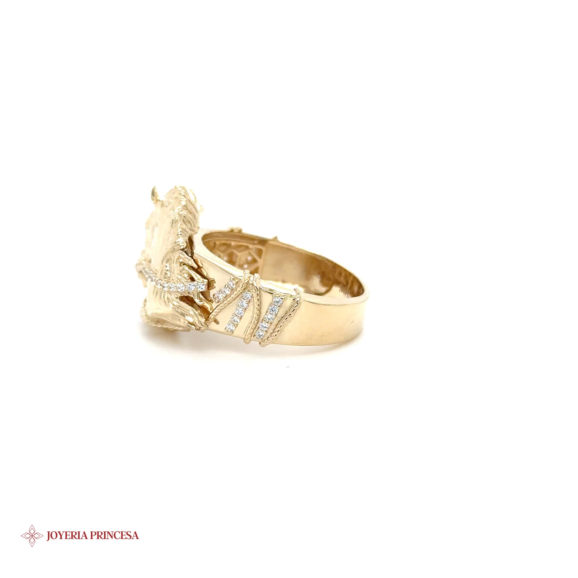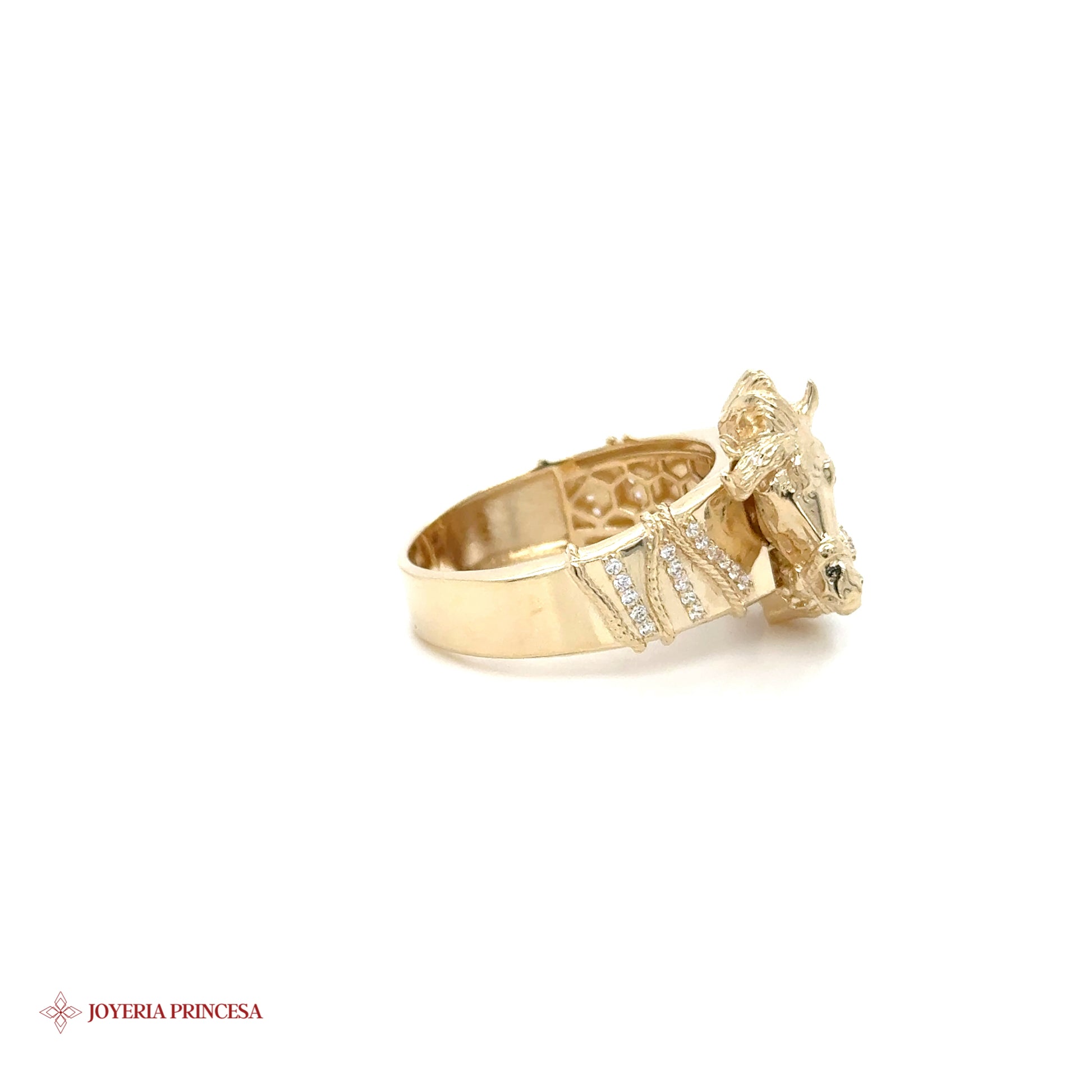 Anillo de oro de 14 quilates con una intrincada cabeza de caballo con detalles de circonitas.