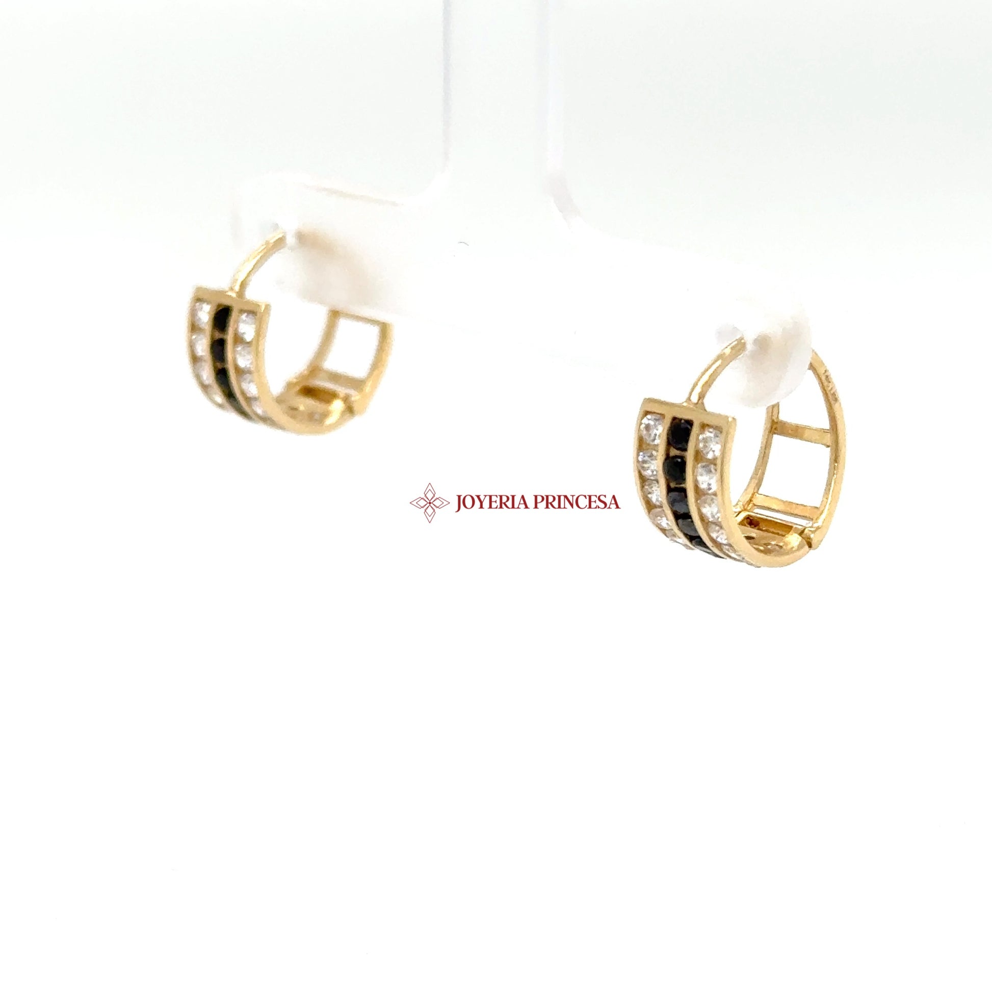 EN: Elevate your style with these chic 14K gold huggie earrings featuring black and clear cubic zirconia stones.