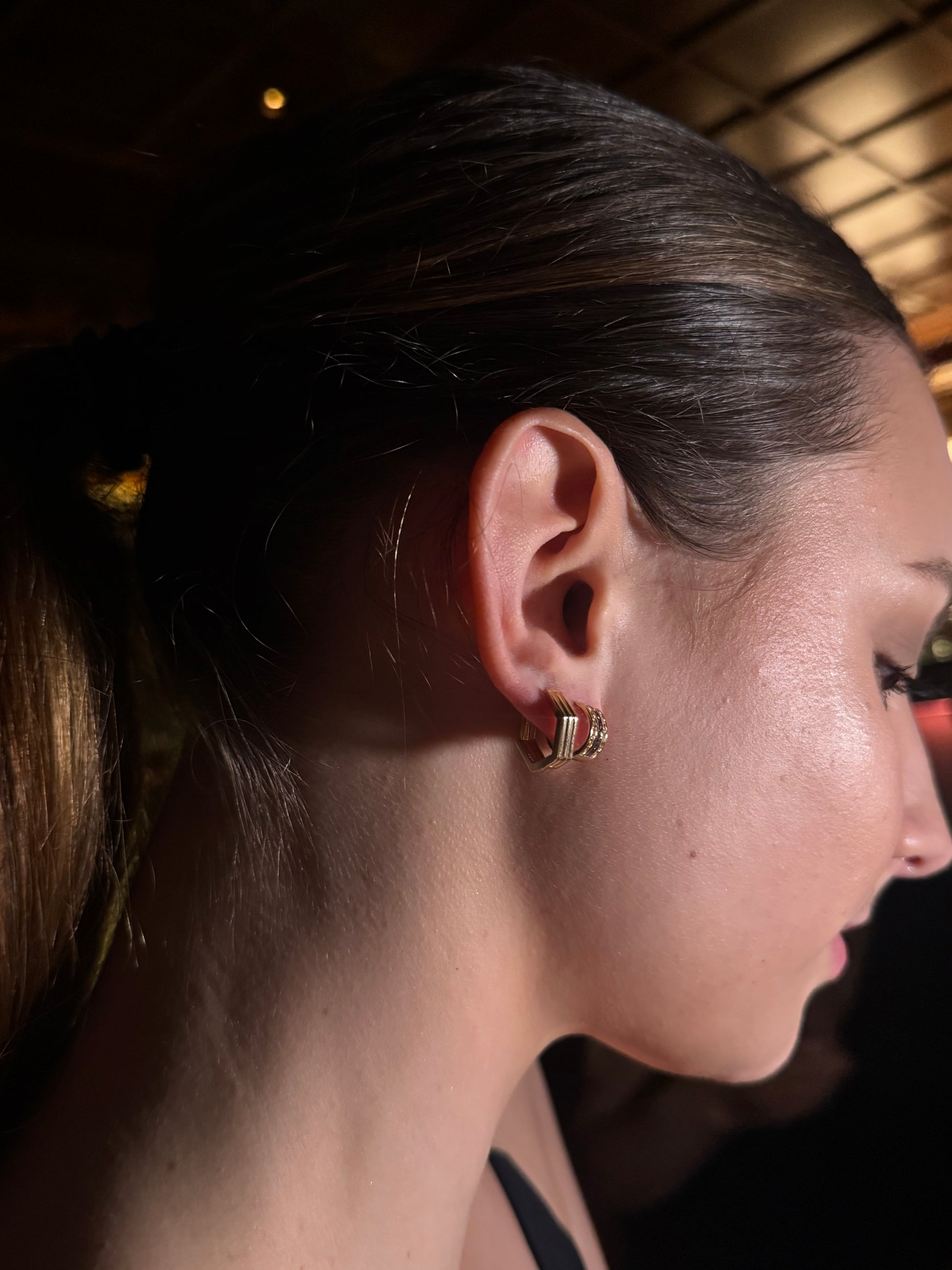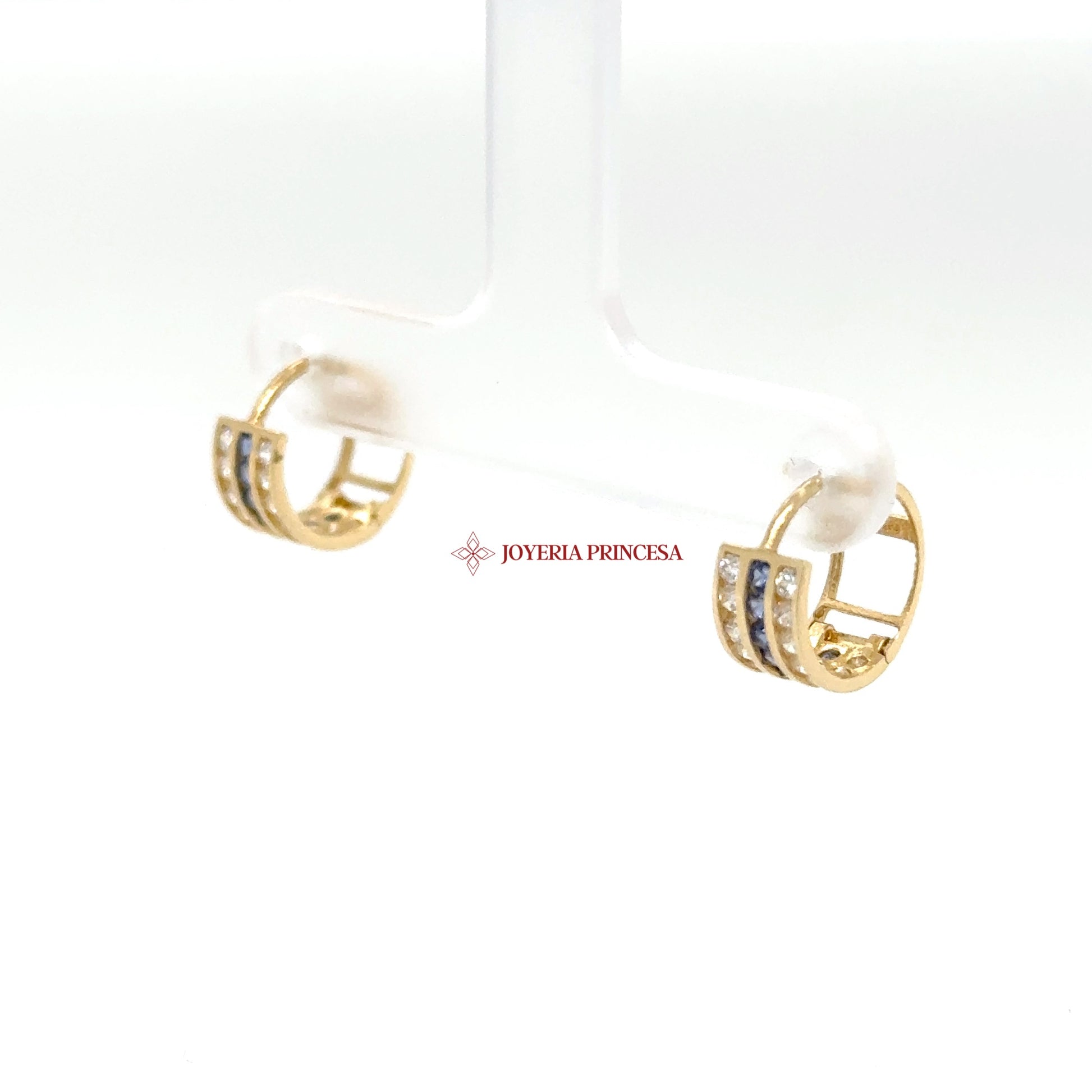 EN: These stunning 14K gold huggie earrings feature vibrant blue cubic zirconia accents for a chic look.