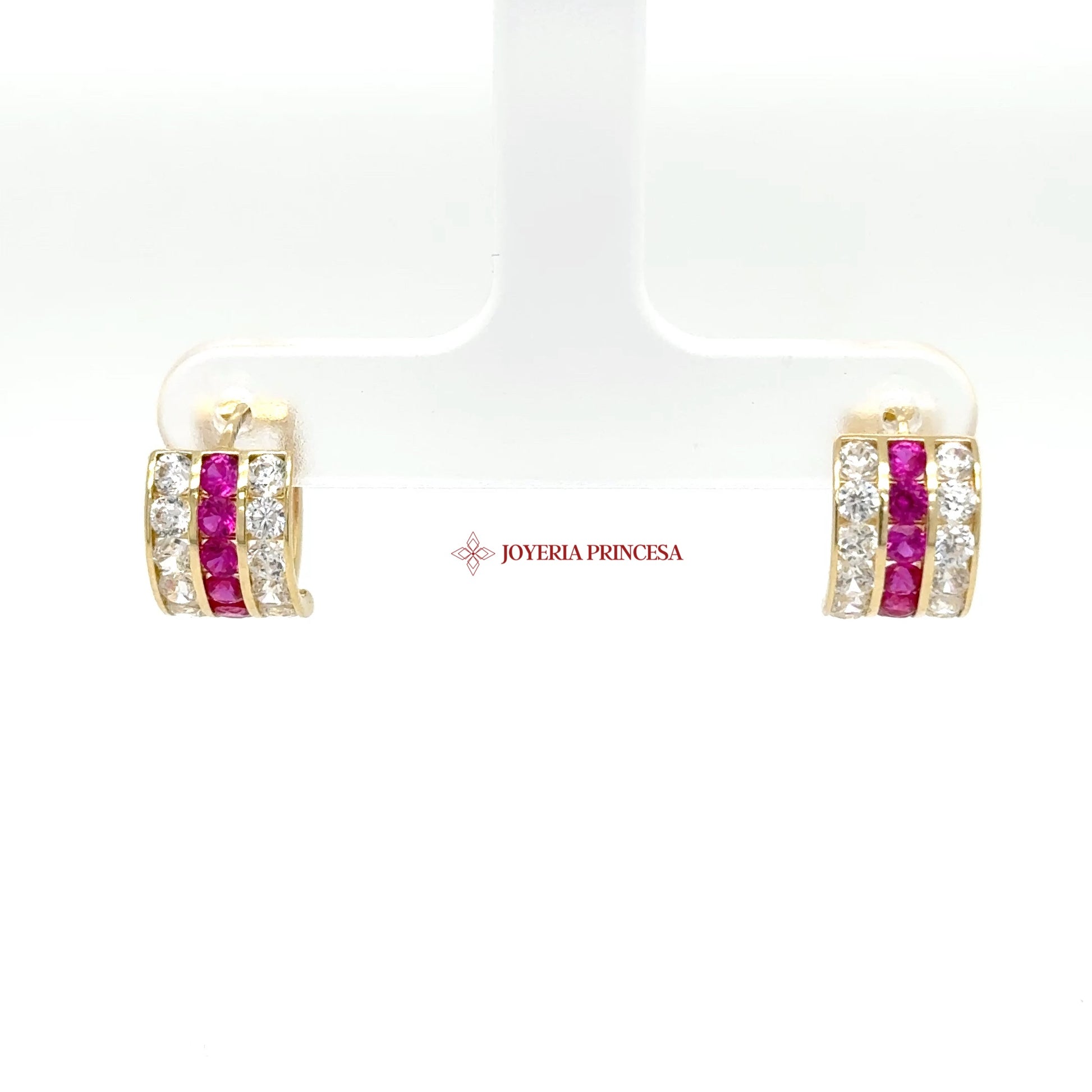 ES: Eleva tu estilo con estos elegantes aretes huggie que presentan vibrantes zirconias cúbicas rosas y piedras claras. Perfectos para cualquier ocasión.
